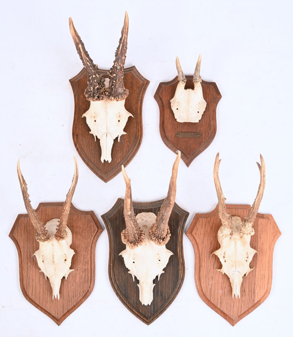 Vijf ree geweien op houten schild.
