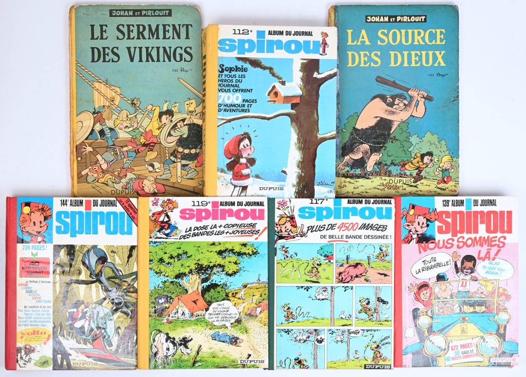 Five ‘Spirou’ collector’s albums. Nos. 112, 117, 119, 139 and 144. In reasonable condition. Plus two titles from the series ‘Johan et Pirlouit’: ‘Le serment des vikings’ and ‘La source des dieux’. With damage.