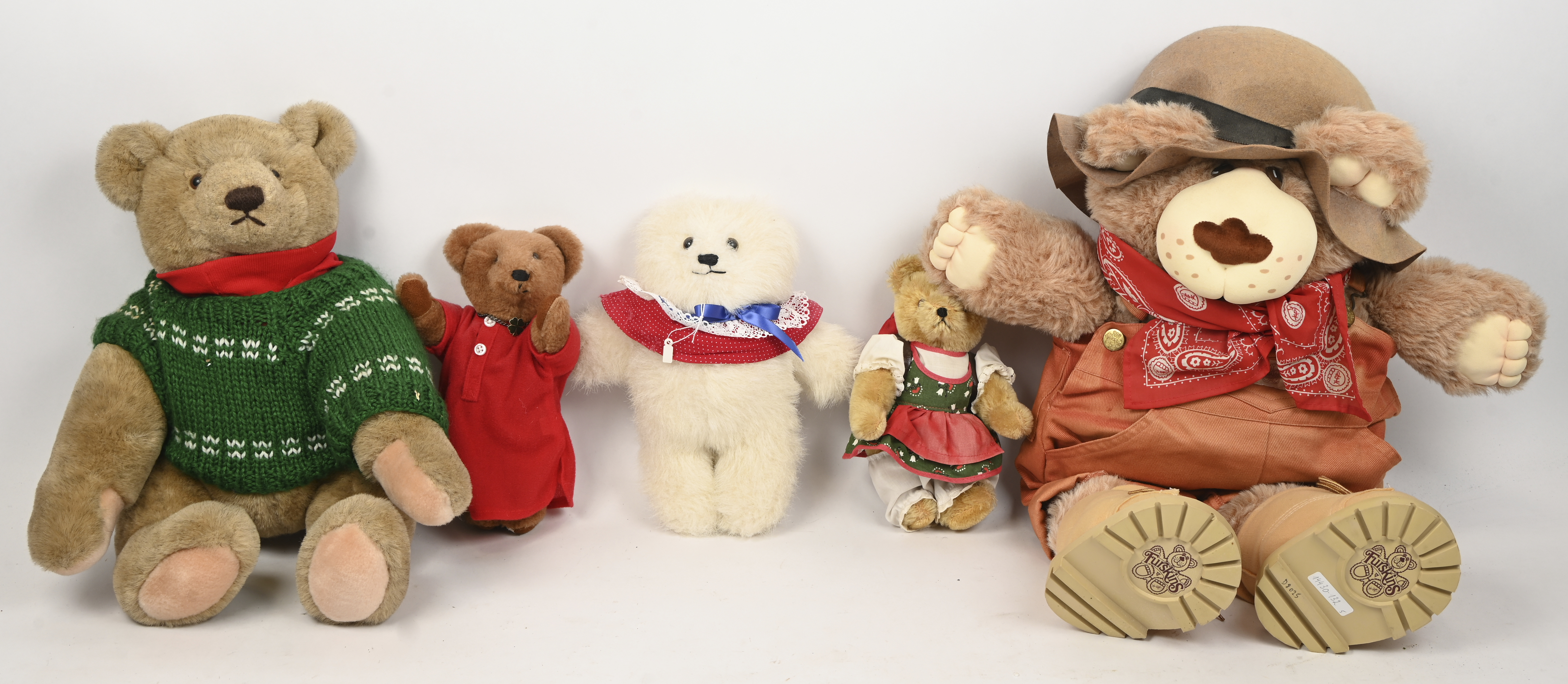 Five teddy bears, various sizes and brands. 'Carrousel', 'Hermann Teddy', 'Gund', 'Furskins', and 1 unbranded.
