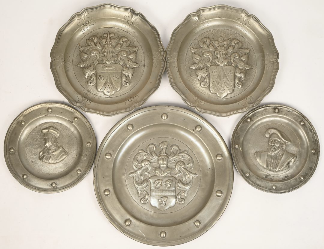 Vijf beeldjes van porselein. Een putto met een wereldbeeld, een moeder met kind, een kandelaar met personage, twee paters en een monochroom groepje van twee kinderen met een kooi.