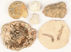 A lot of six fossils, including a trilobite, an ammonite, a piece of petrified wood, a plate with two fish, and two pieces of sponge.