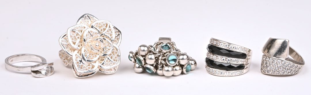#65Vijf verschillende zilveren ringen bezet met fantasiestenen. 925‰.
