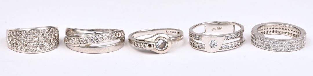 #75Vijf verschillende zilveren ringen bezet met fantasiestenen. 925‰.