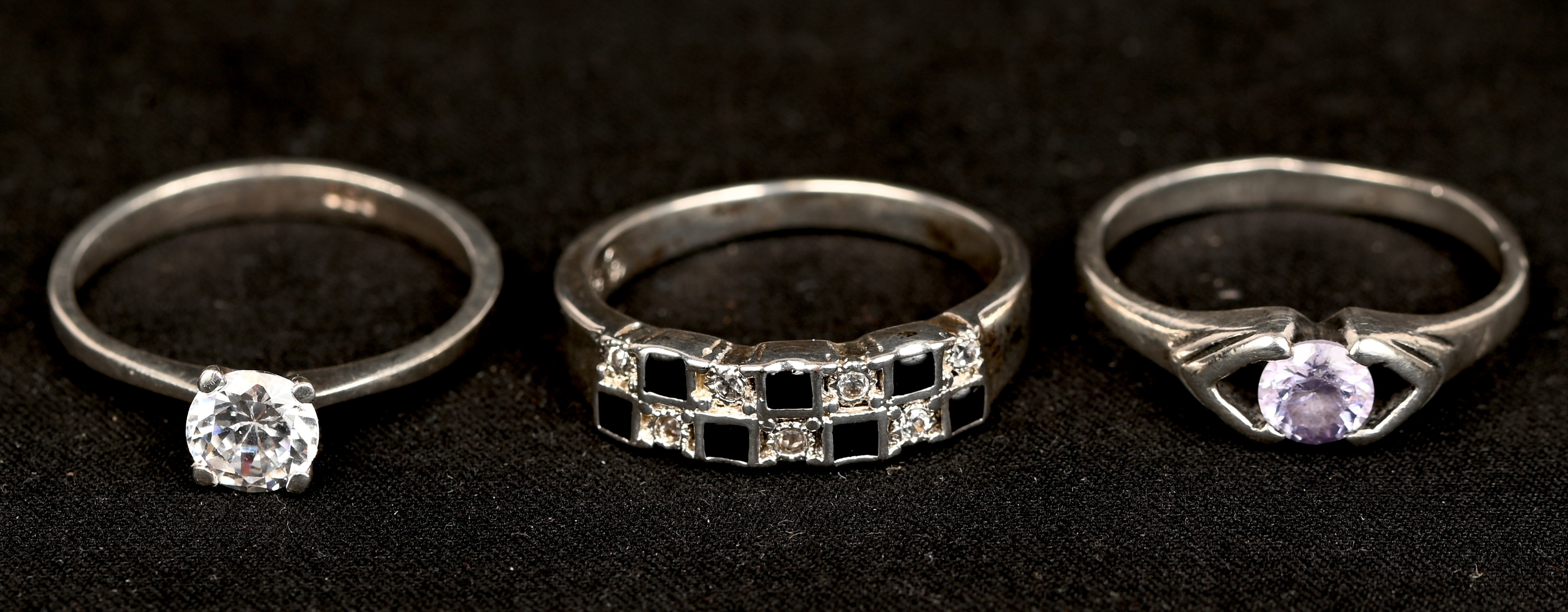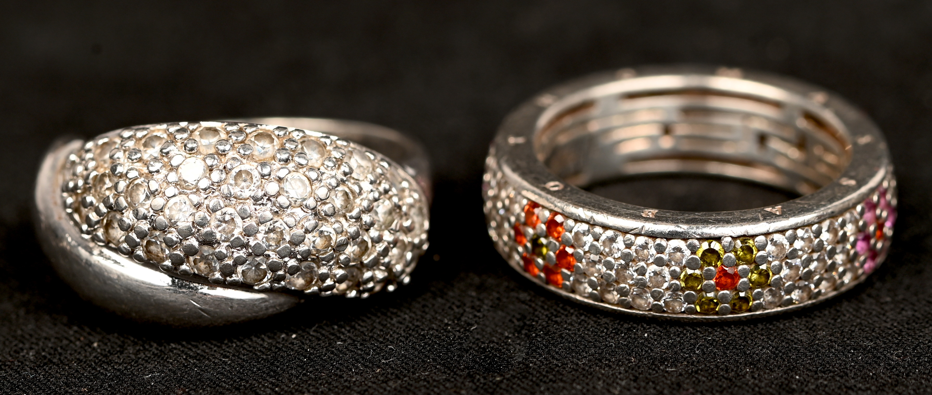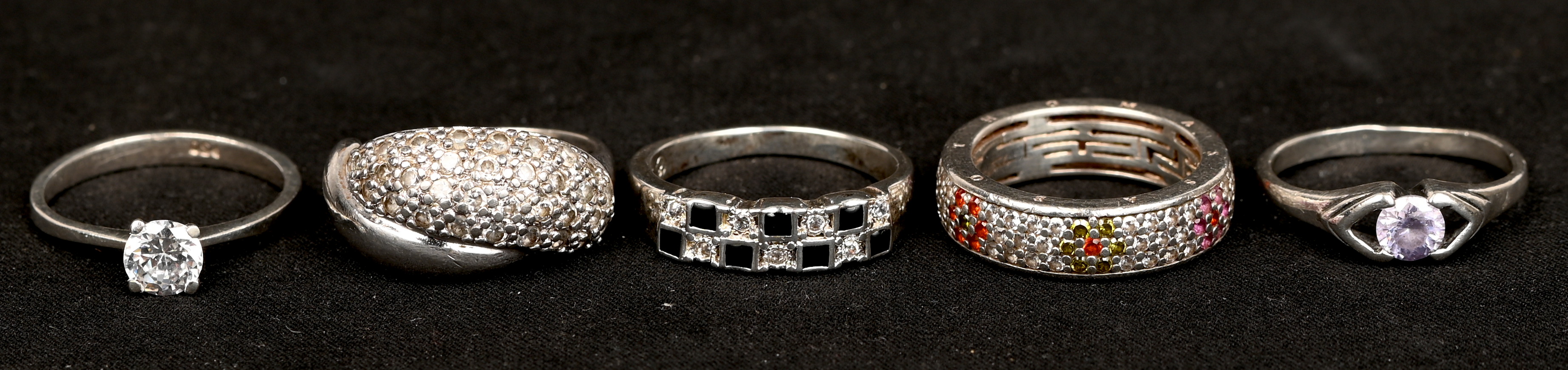 Vijf verschillende zilveren ringen bezet met fantasiestenen. 925‰.