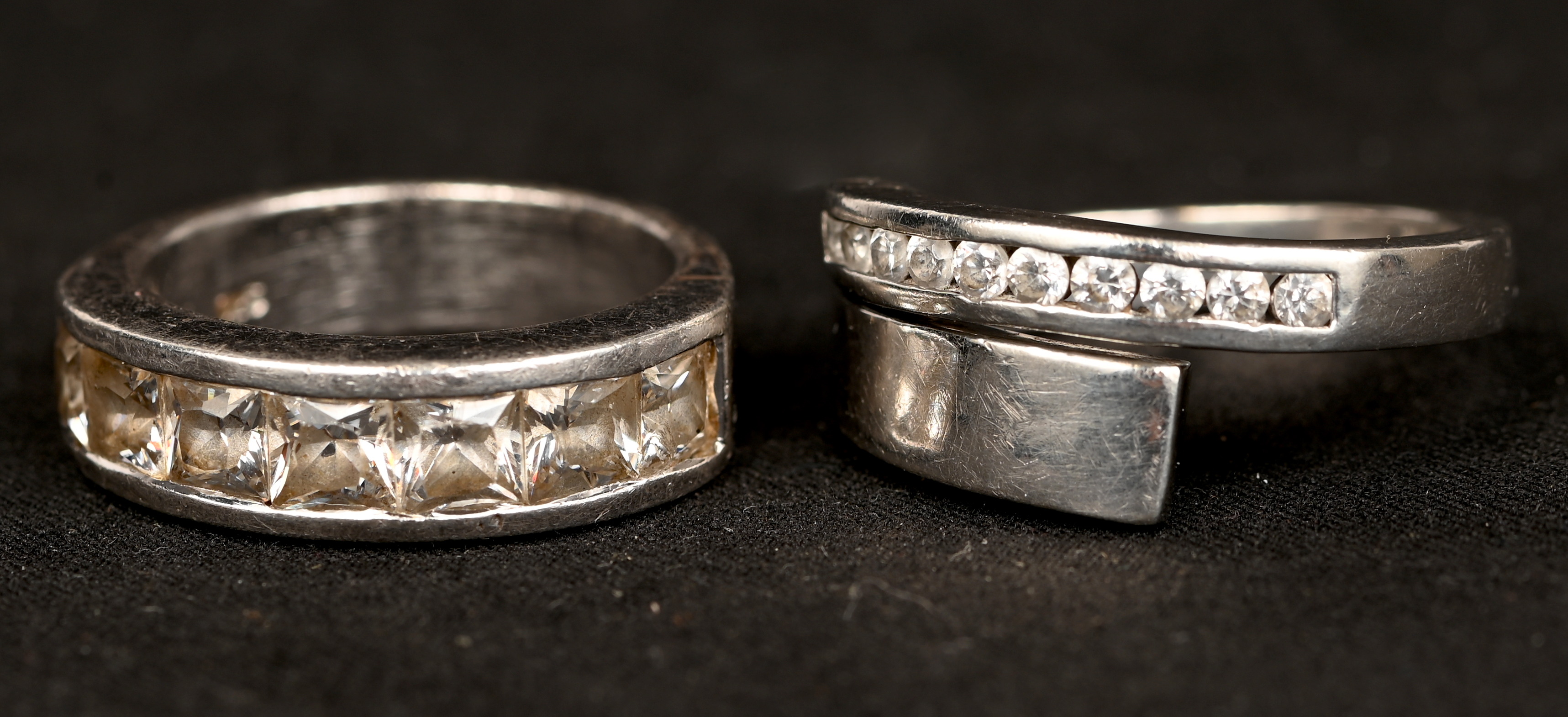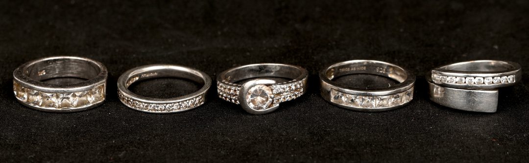 Een 18 kt witgouden ring bezet met fantasiestenen.