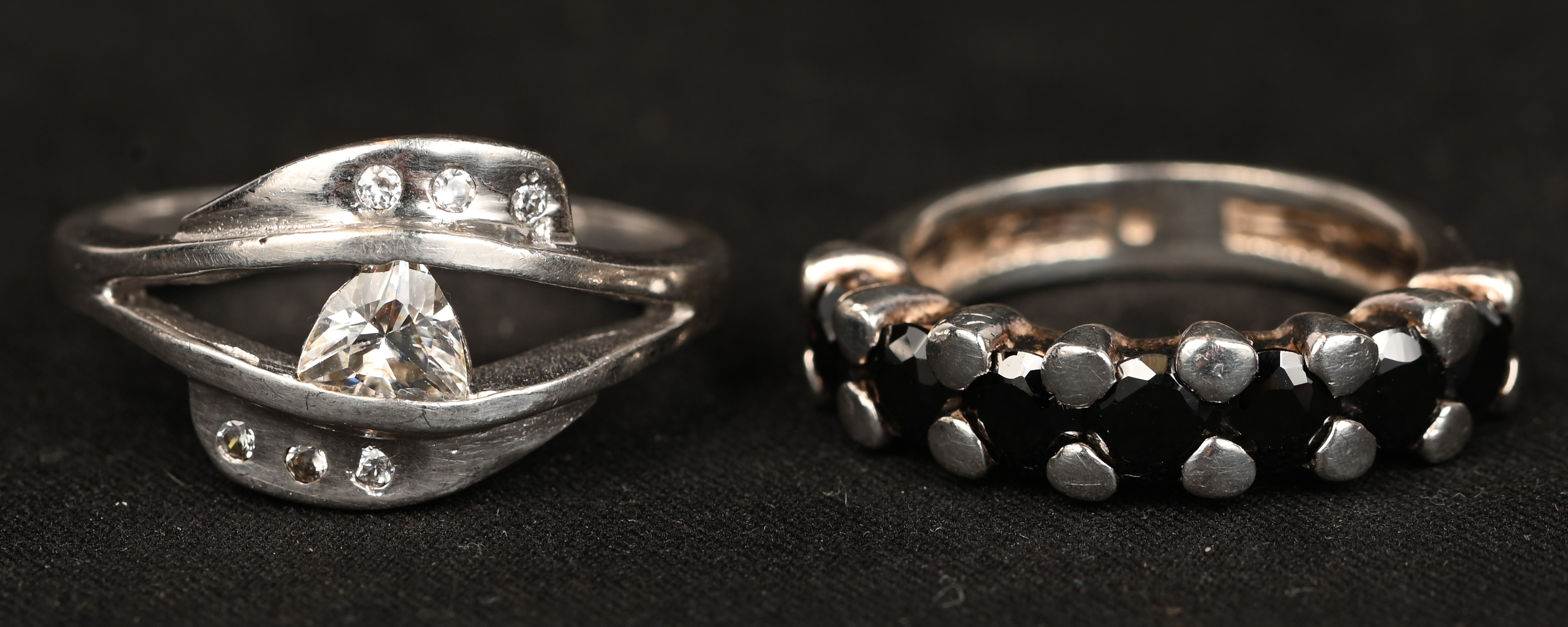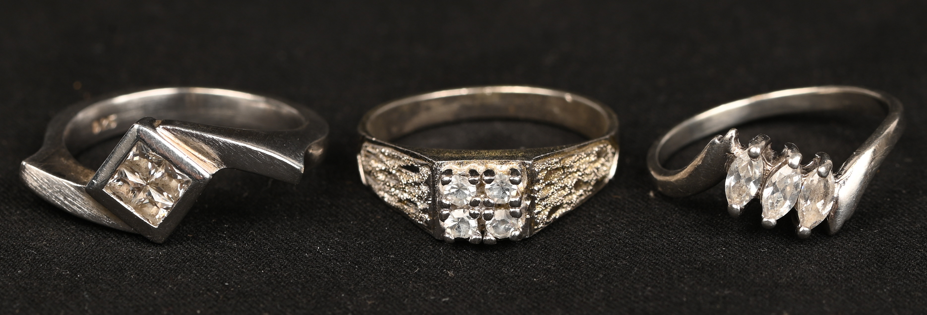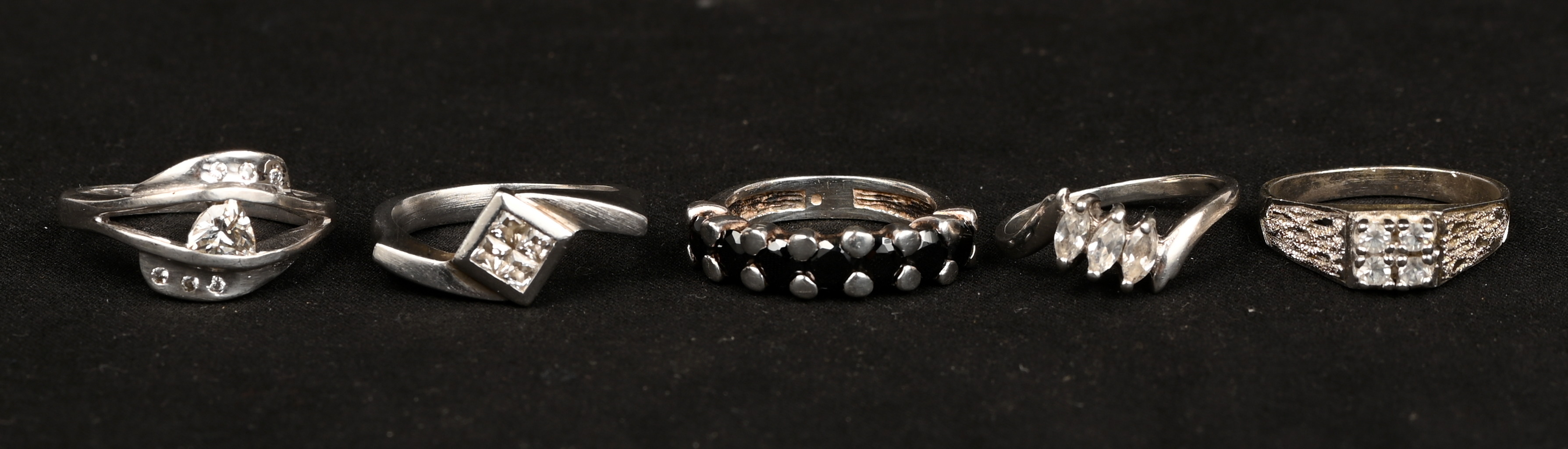 Een 18 kt witgouden ring bezet met fantasiestenen.