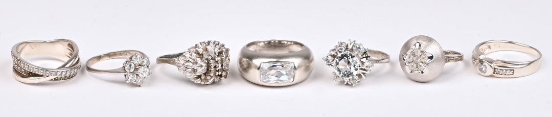 #65Vijf verschillende zilveren ringen bezet met fantasiestenen. 925‰.