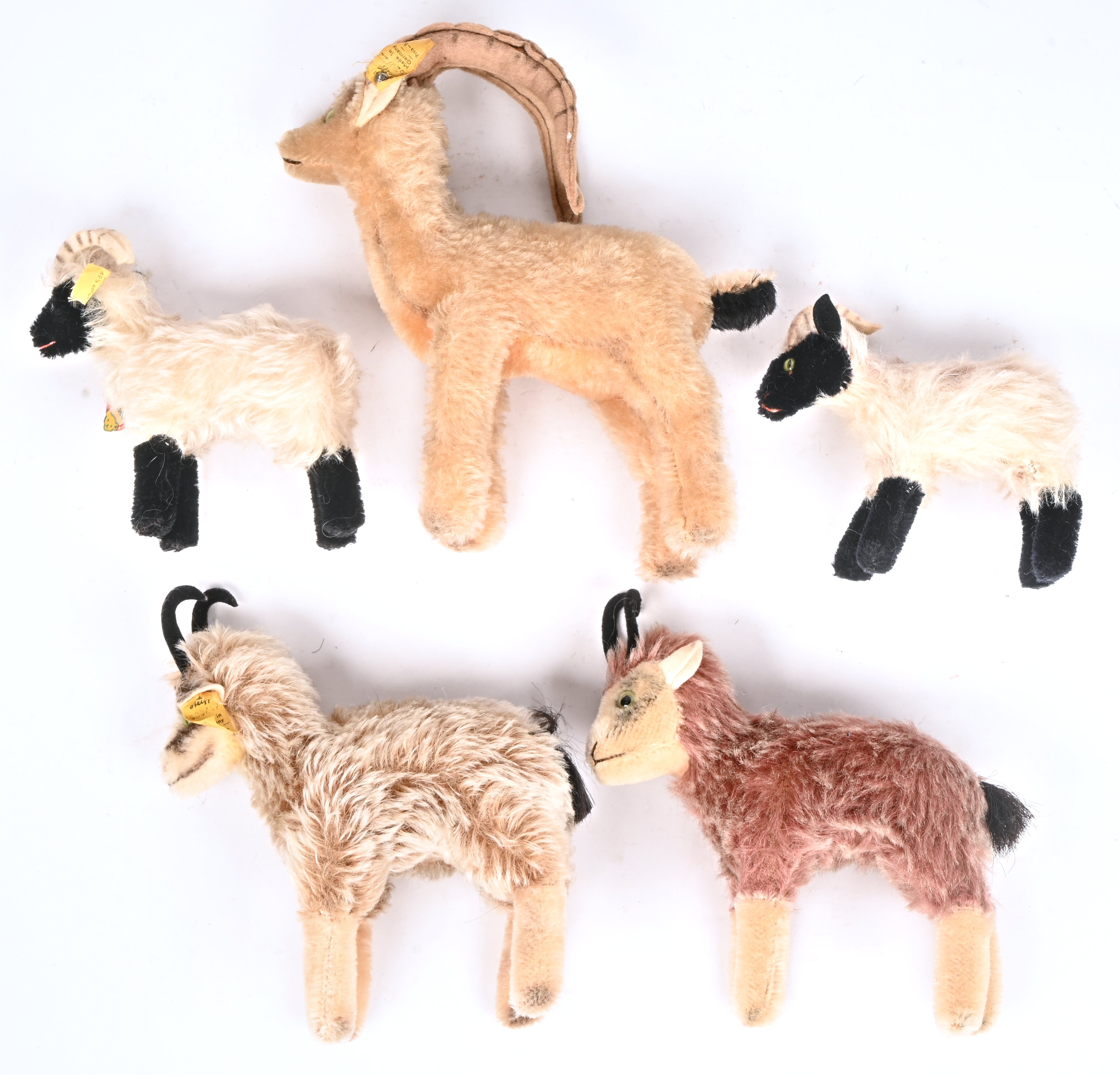 Five vintage plush goats, three marked Steiff, one missing button/tag, and one marked Grisly. -