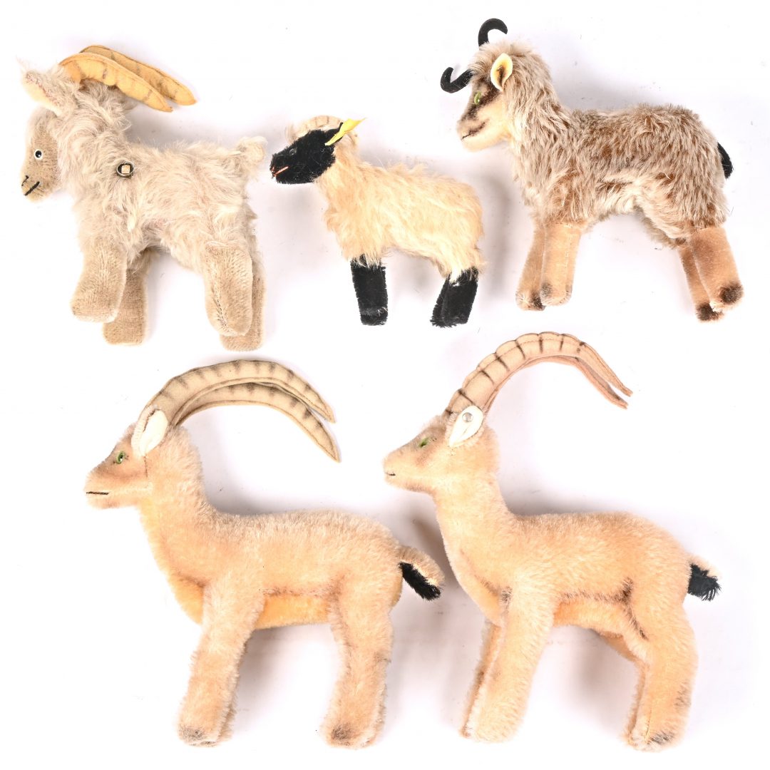 Five vintage plush goats, three marked Steiff, the others missing their button/tag. -