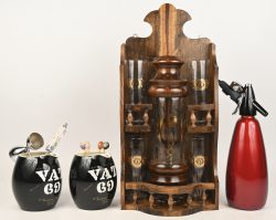 #142Een houten rekje met vier whiskyglazen en een whiskyfonteintje met houten deksel. We voegen er aan toe: een syphon, een paar aardewerken waterkannetjes van VAT69 en enkele lepeltjs e.d., sommige versierd met pokerstenen.