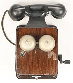 An old wall-mounted telephone. Wood and bakelite. -