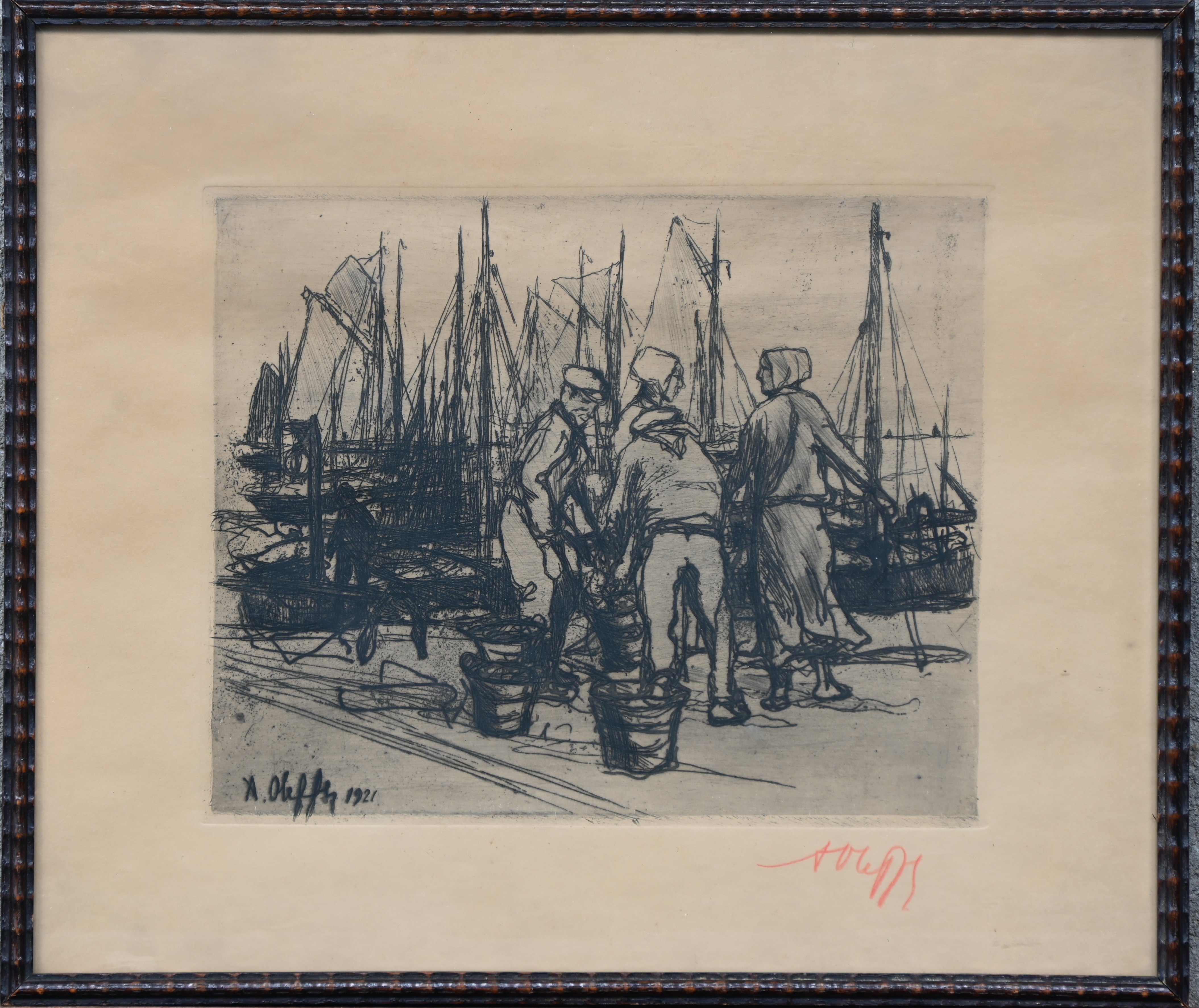 #184Frans Masereel‘l’Aigle de Distelmonde’, een monochrome ets. Getekend binnen de plaat; Frans Masereel. De ets is gemaakt voor de Contes d’Horace Van Offel, een bibliofiele uitgave met 22 kortverhalen van de auteur Horace Van Offel (Antwerpen, 1878-1944) uitgegeven door de “Editions des artistes” in Brussel in 1935.
