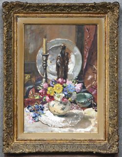 'Still Life with Flower Vase and Candlestick', oil on panel. -