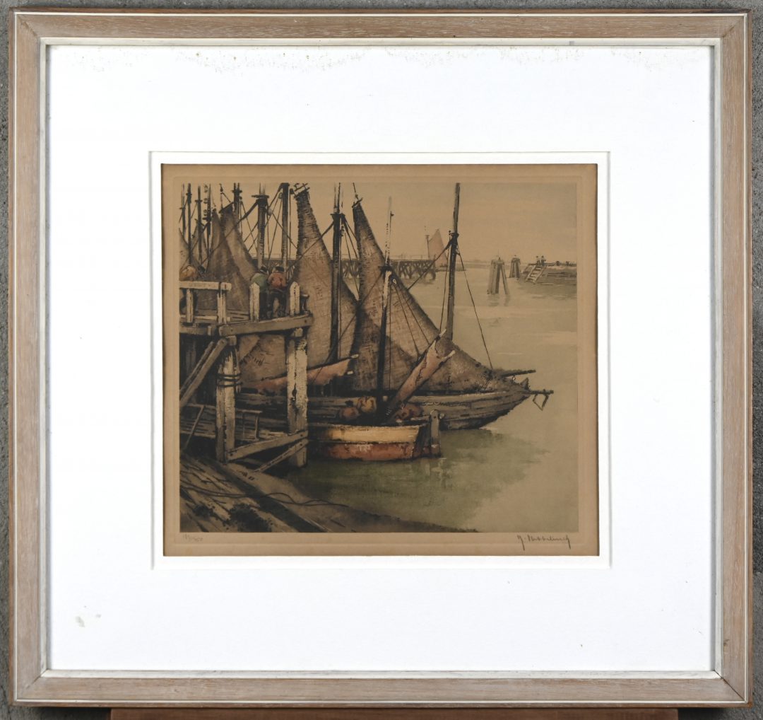 ‘River Fishermen, Willebroek Canal’, a monochrome etching. Signed; Rom. Malfliet. Number 23 out of an edition of 50 copies. -