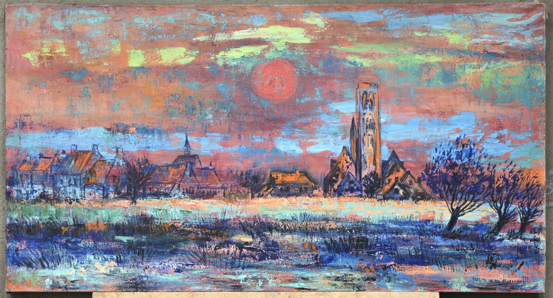 ‘Vlaams landschap’, een expressionistisch olieverfschilderij op doek. Getekend en gedateerd 1974.