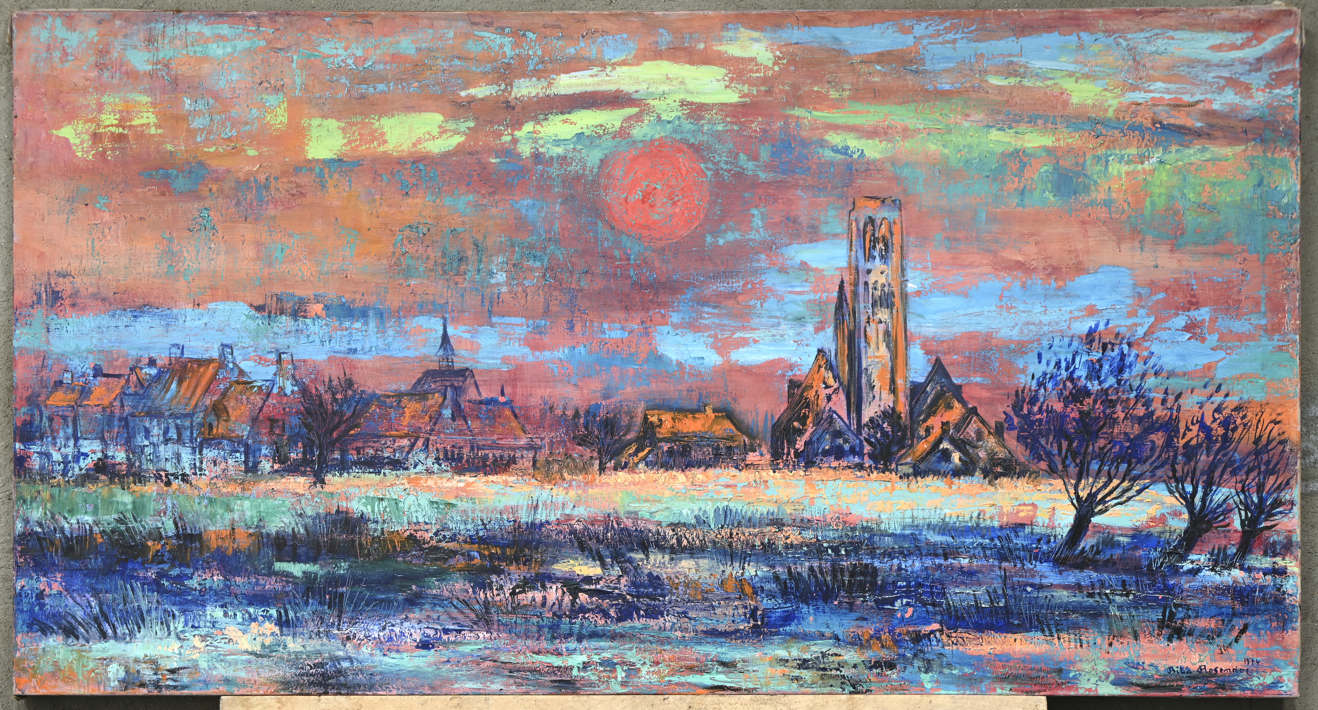 “Flemish landscape”, an expressionist oil painting on canvas. Signed and dated 1974.