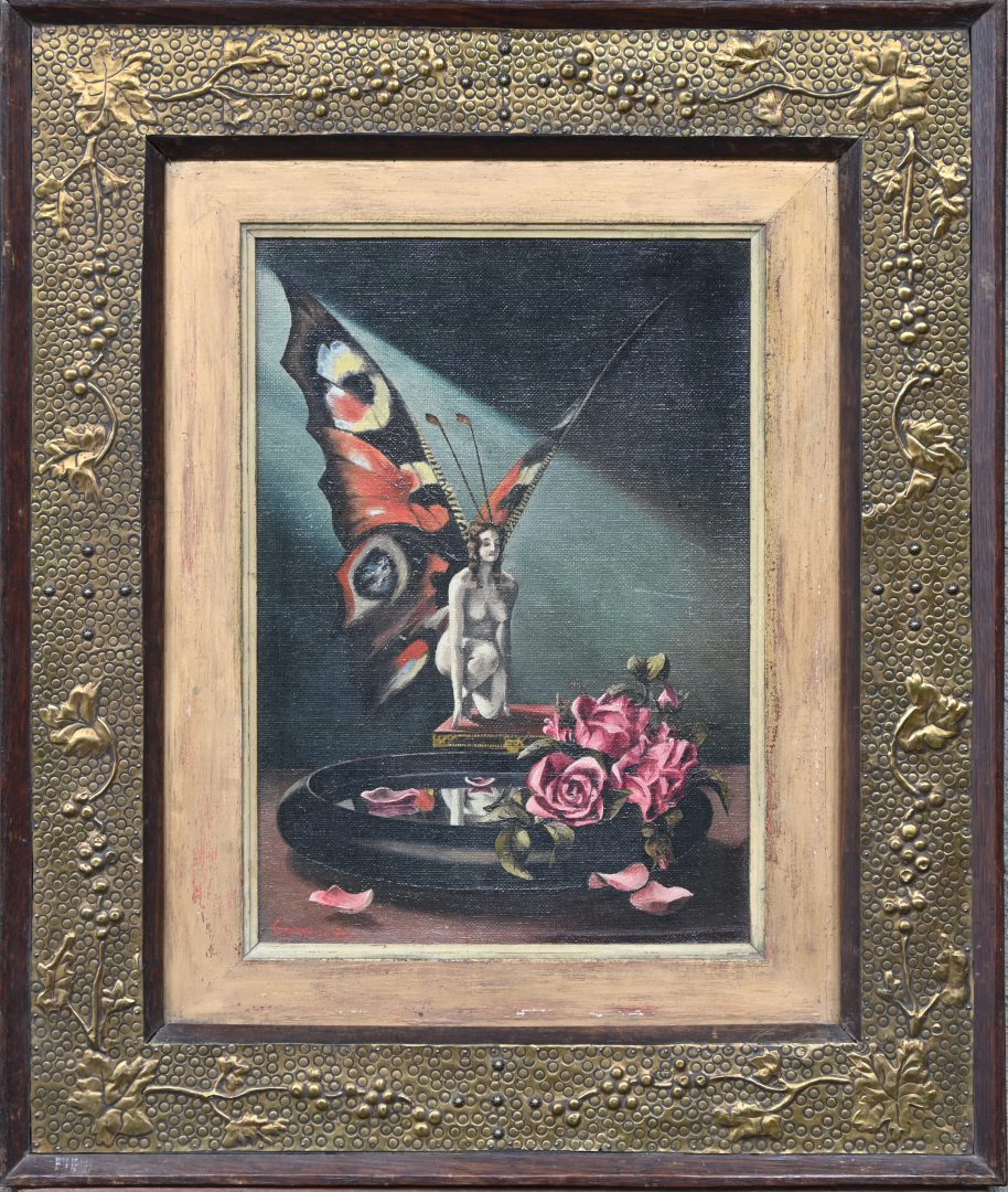‘Vlindervrouw’, olieverf op gemaroufleerd doek. Getekend Gorima La Duc(?).