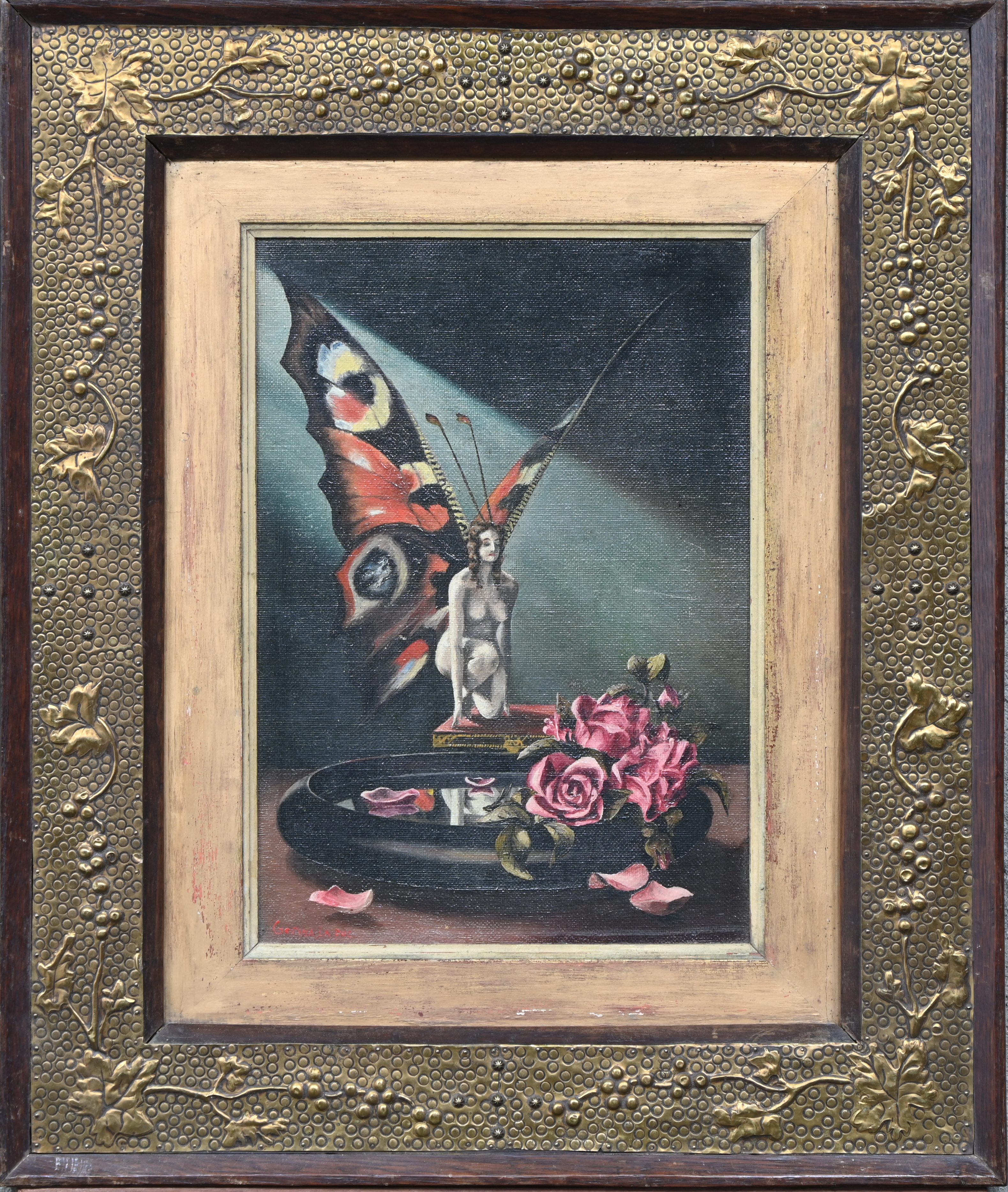 'Butterfly Woman', oil on canvas mounted on board. Signed Gorima La Duc(?).