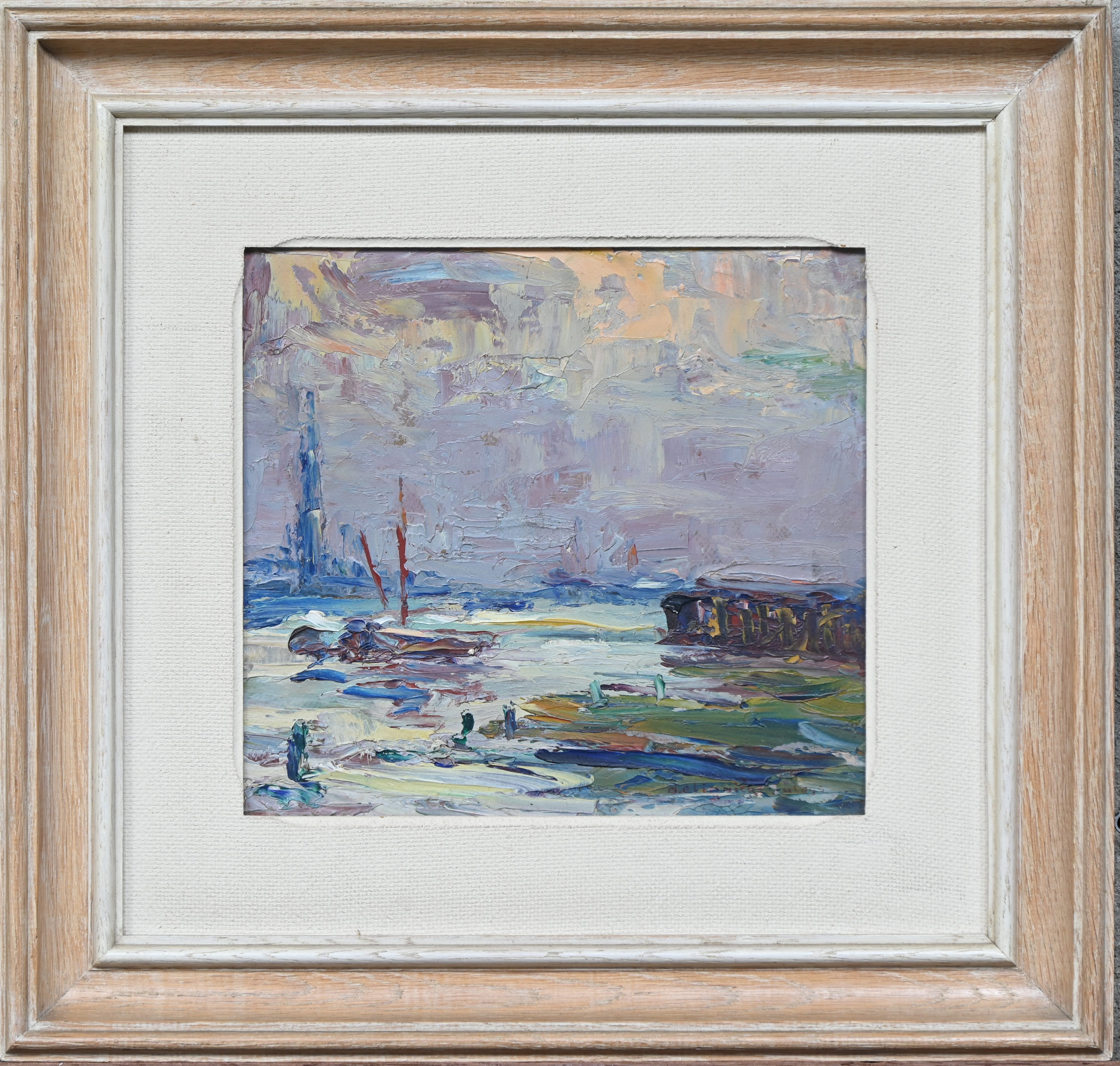 ‘Vrachtschepen op de Schelde’, olieverf op paneel. Getekend Aloys De Lignière.