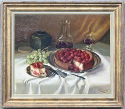 #542Lode SebregtsPeriod: 1906 - 2002‘De taart’, olieverf op doek. Een post-impressionistisch werk getekend L. Sebregts. Sebregts genoot zijn opleiding aan de Academie van Antwerpen en het NHISKA, bij Isidoor Opsomer en Albert Saverys.
