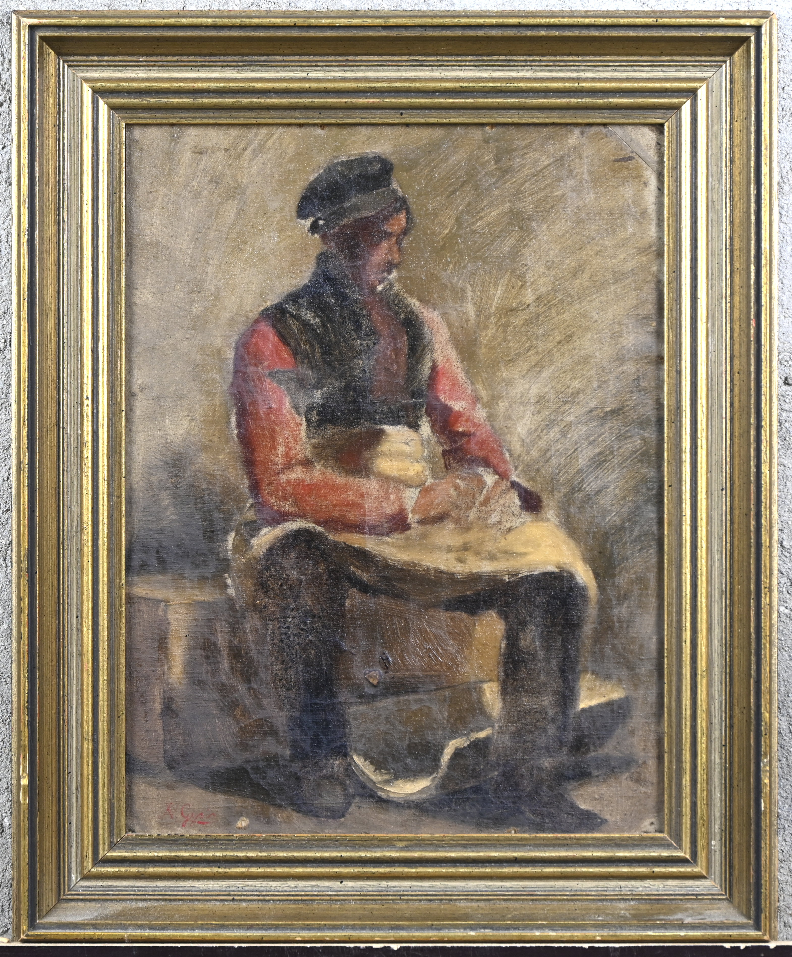 "Fishermen and fishing boats on the beach". Oil on panel. -