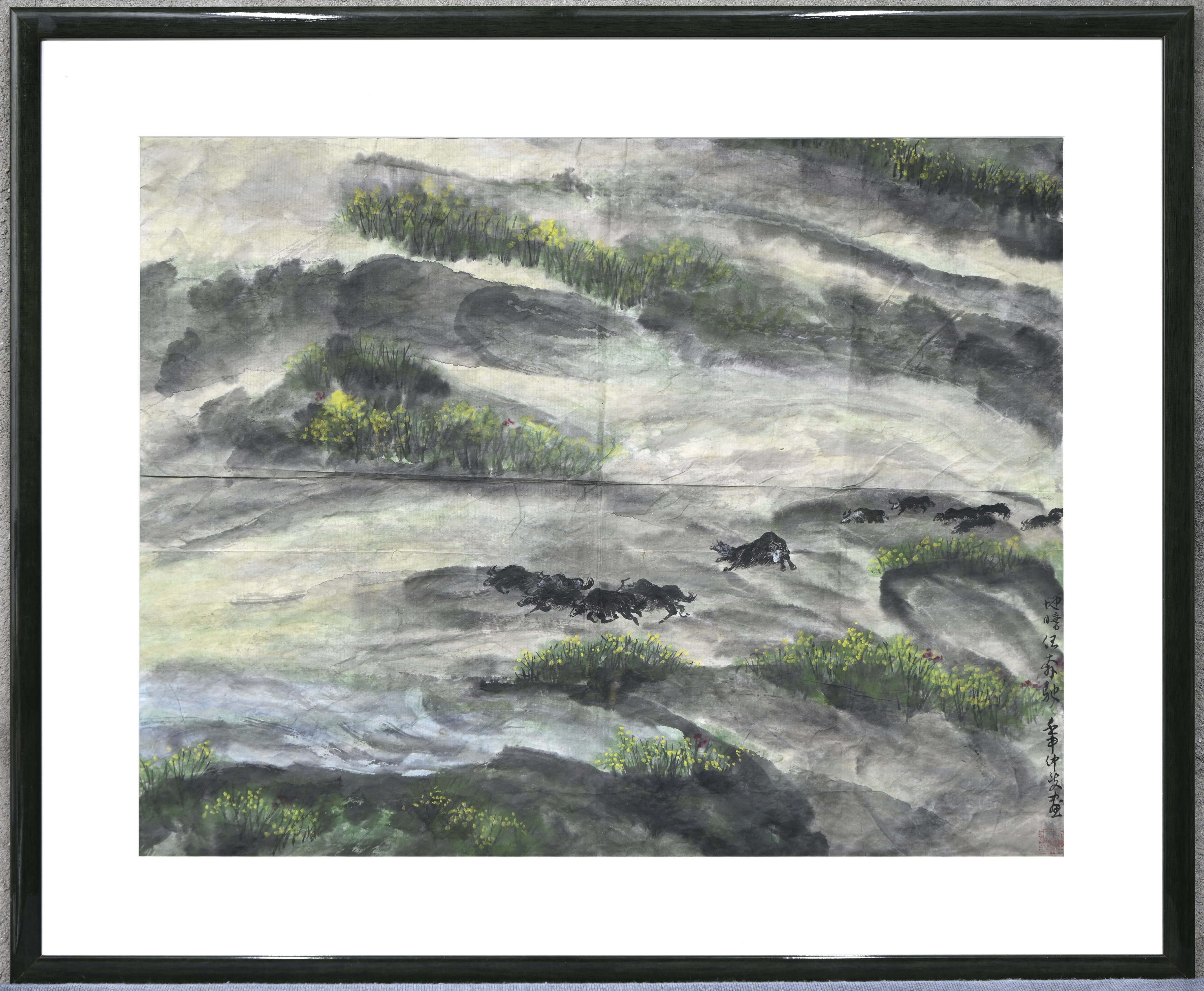 "Cows in the Ditch", a painting, oil on canvas, unsigned. -