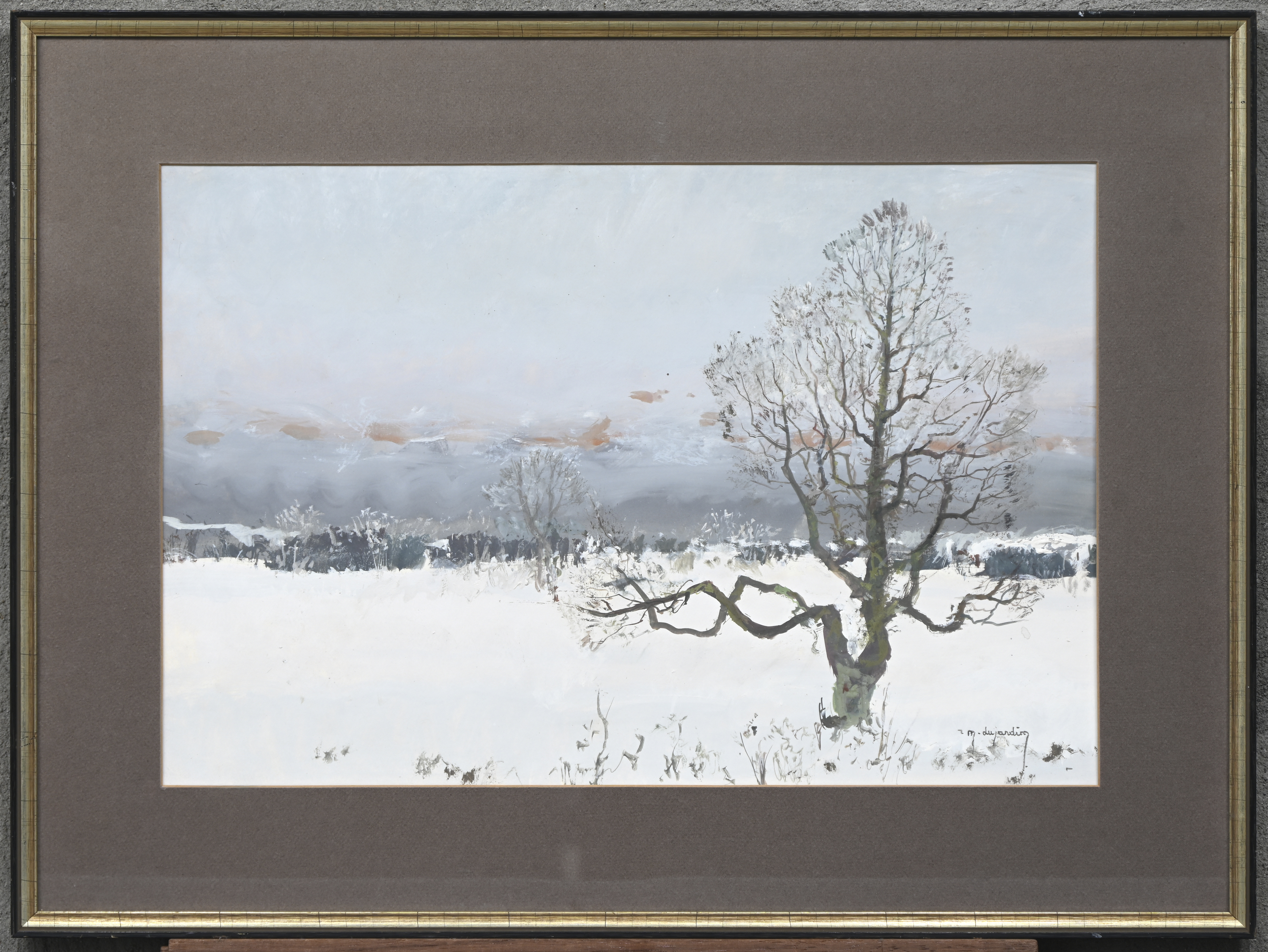 ‘Winterlandschap’, acryl op papier. Een post-impressionistisch werk, getekend M. Dujardin.