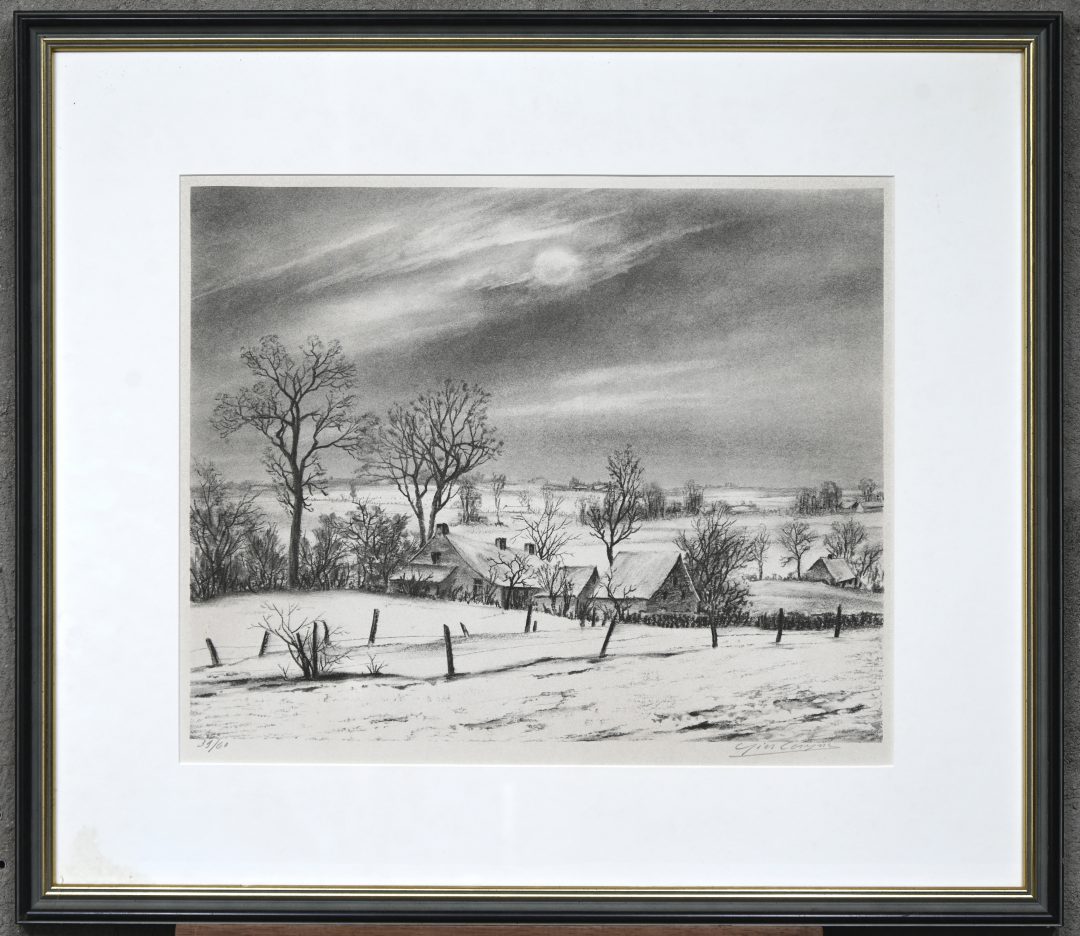 Een gevarieerd lot kaders, bestaande uit een ets, een gravure en een tekening.