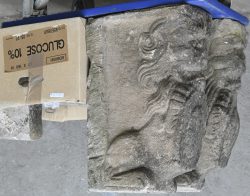 A set of two stone lions, resting on a shield, with some additional parts originating from an old fireplace. -