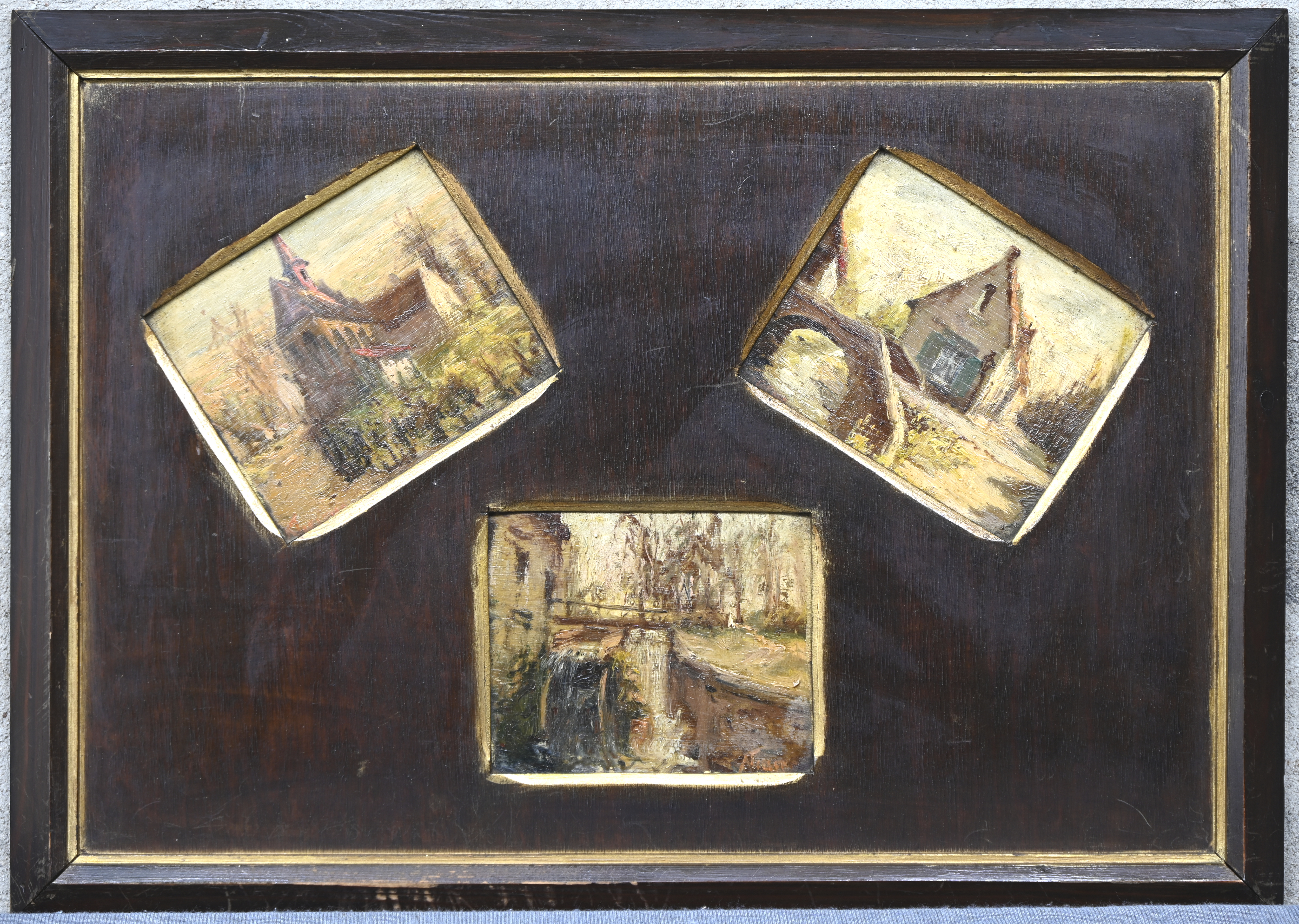 #462Léon Delderenne“Hoevezicht”. Een schilderij, olieverf op paneel, gesigneerd L. Delderenne.Beschadigde kader.