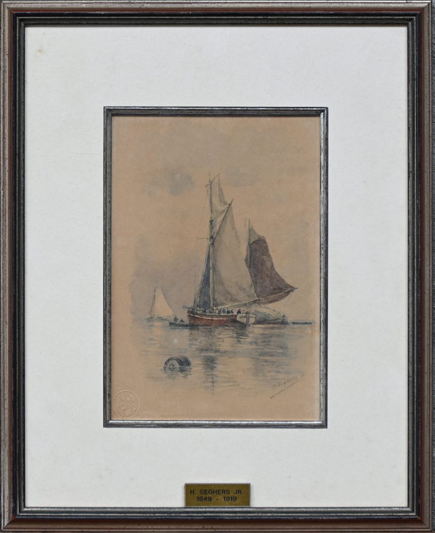 ‘Zeilschepen’, een aquarel. Getekend H. Seghers jr.
