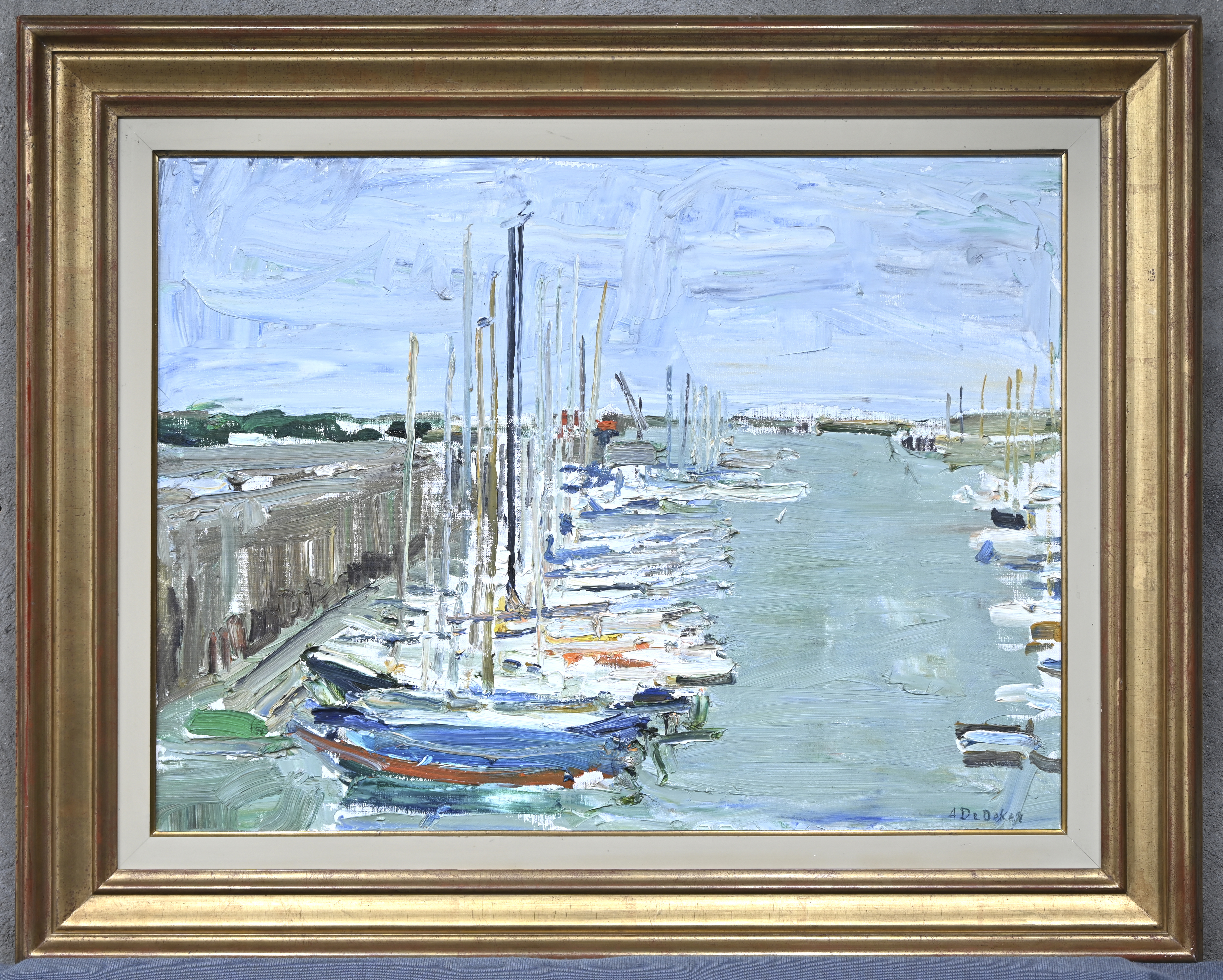 'Sailing Ships in the Harbor', oil on canvas. Signed A. De Deken.