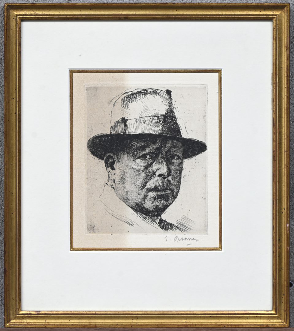 ‘Self-portrait’, a monochrome etching. Signed I. Opsomer.