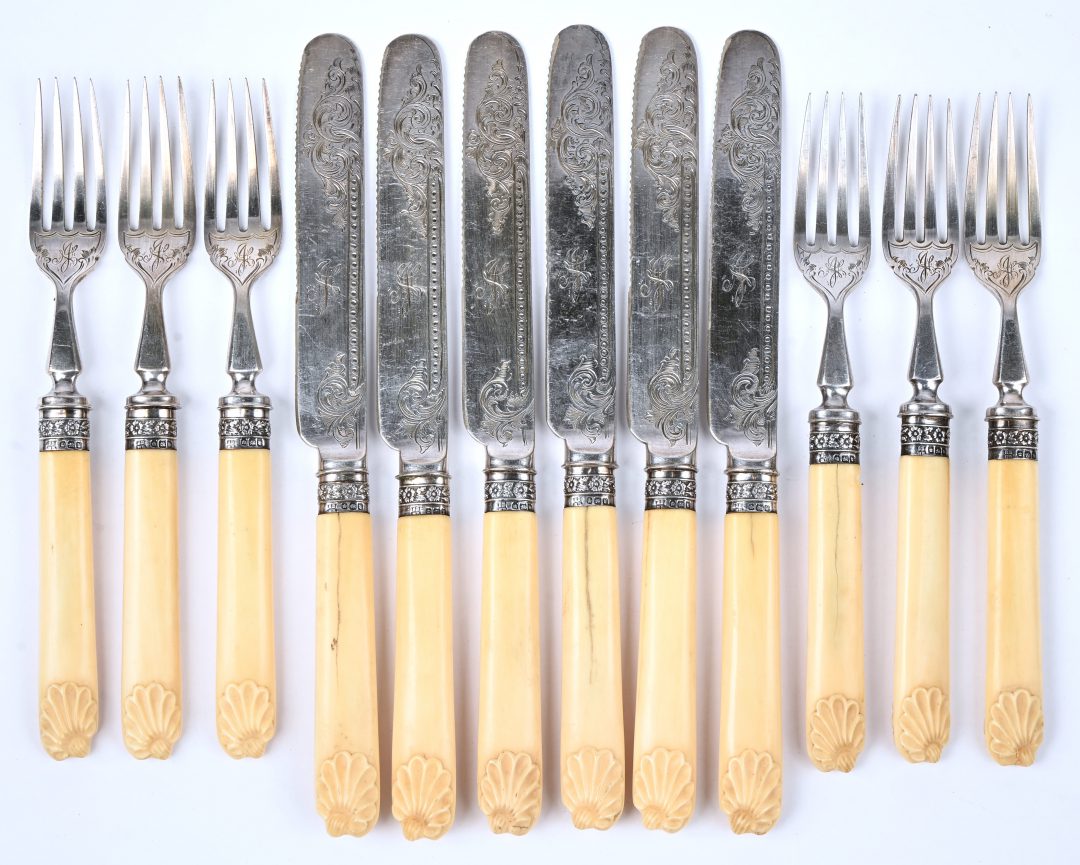 Zes dessertvorken en botermessen met ivorine handvat en een zilveren biesje. Met Engelse keuren.