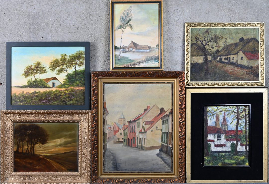 #246Raymond Jean BizetPeriod: 1922-2015‘Zichten op de kerktoren’. Een paar olieverfschilderijen op paneel, getekend; R. J. Bizet.