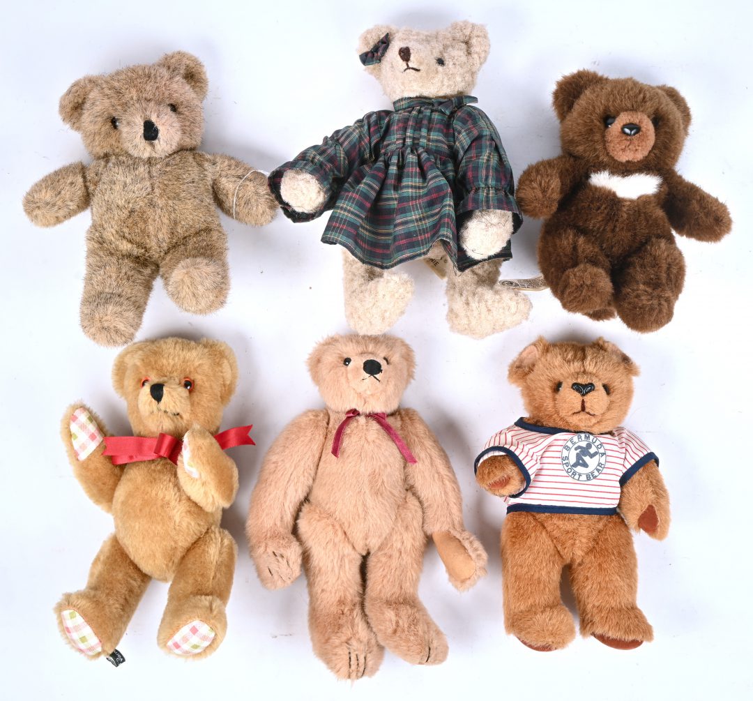 #73Een partij van vijf middelgrote teddyberen. Vier merkloos en één met label ‘Just Friends, made in Korea, 1988’.