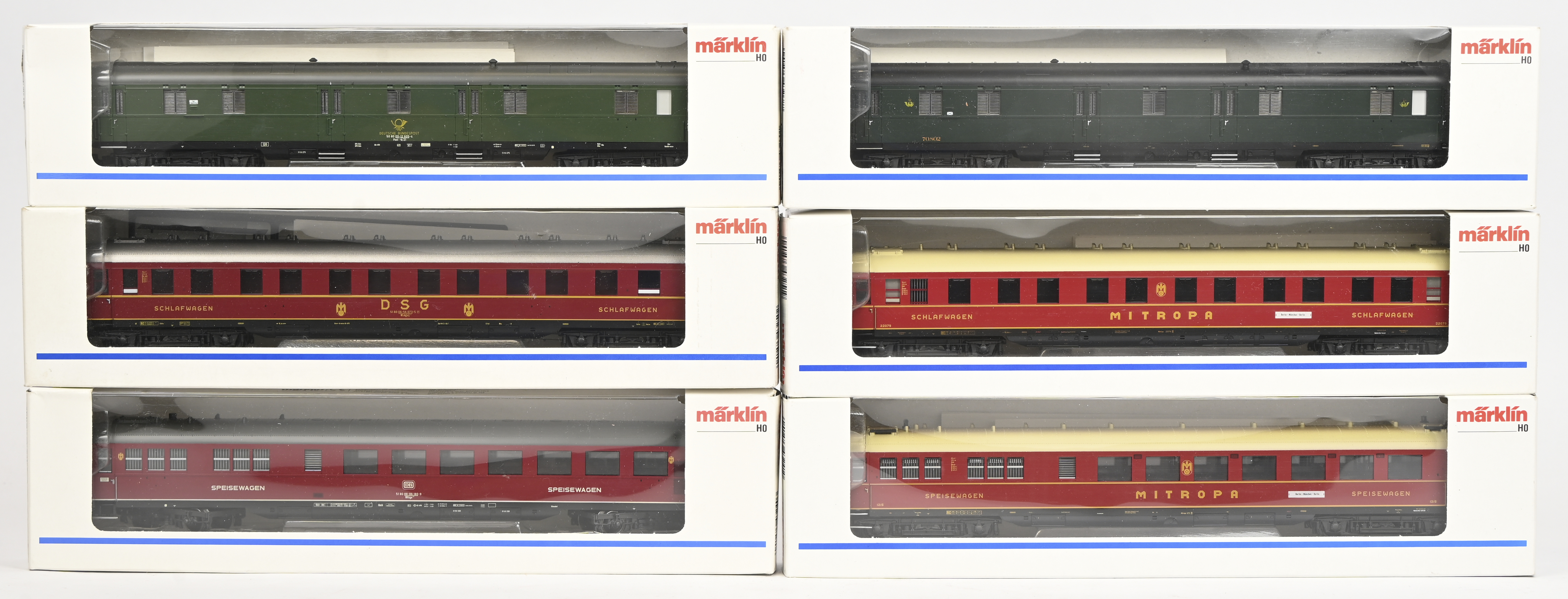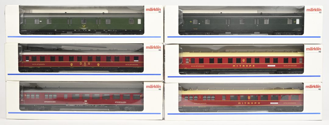 Zes Märklin wagons voor personenvervoer. 43240, 43241, 43250, 43251, 43260 en 43268. In OVP.