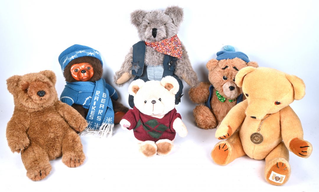 Zes middelgrote knuffelberen, verschillende merken en afmetingen. ‘Animal Fair’, ‘Wallace Berrie & Co.’, ‘World Wildlife Fund’, ‘House of Nisbet’, ‘Mereart’ en ‘Robert Raikes’.