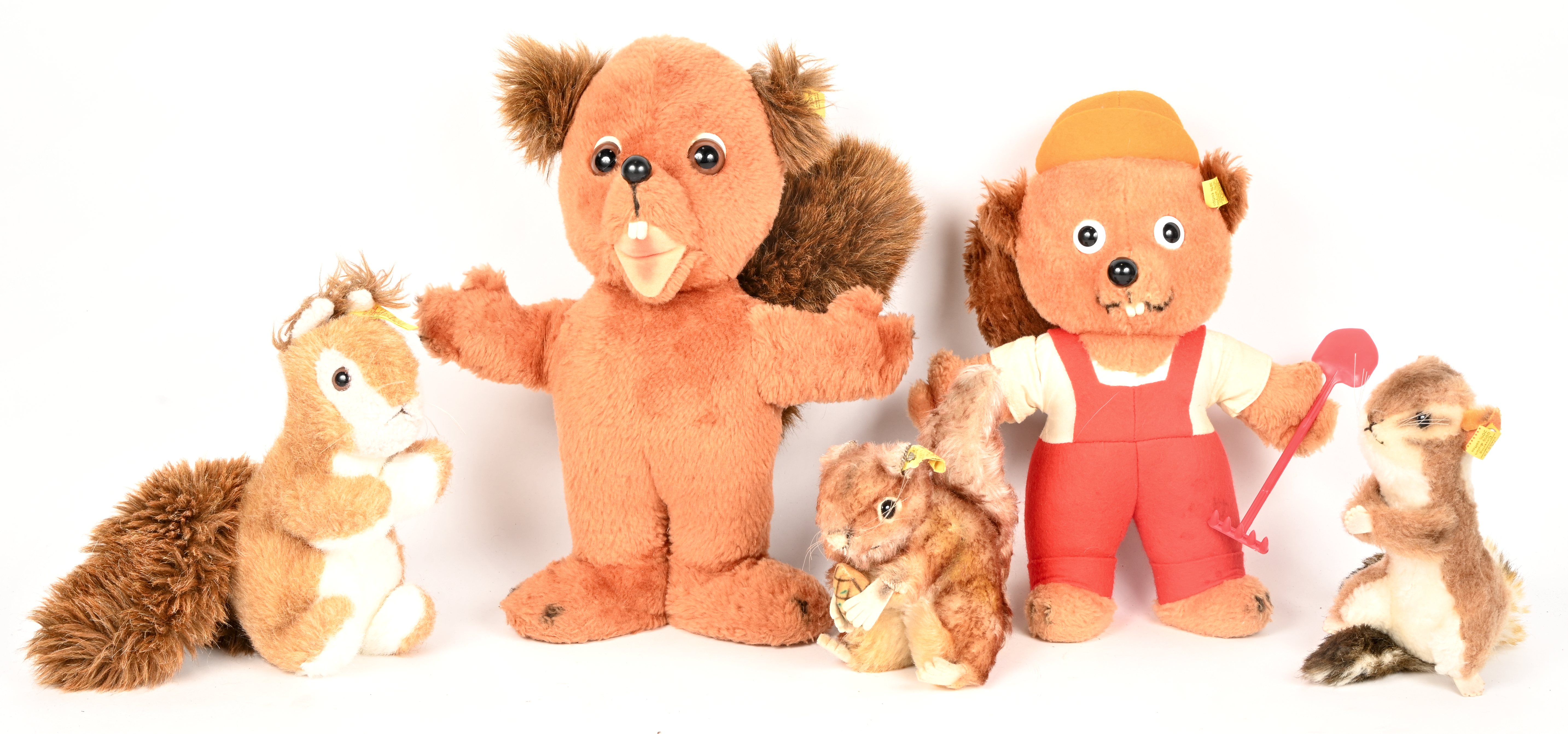 Seven vintage plush felines, three marked Steiff, the rest with missing button/label.No longer availableDim. h 18 cmEstimate: € 100 / 150 -