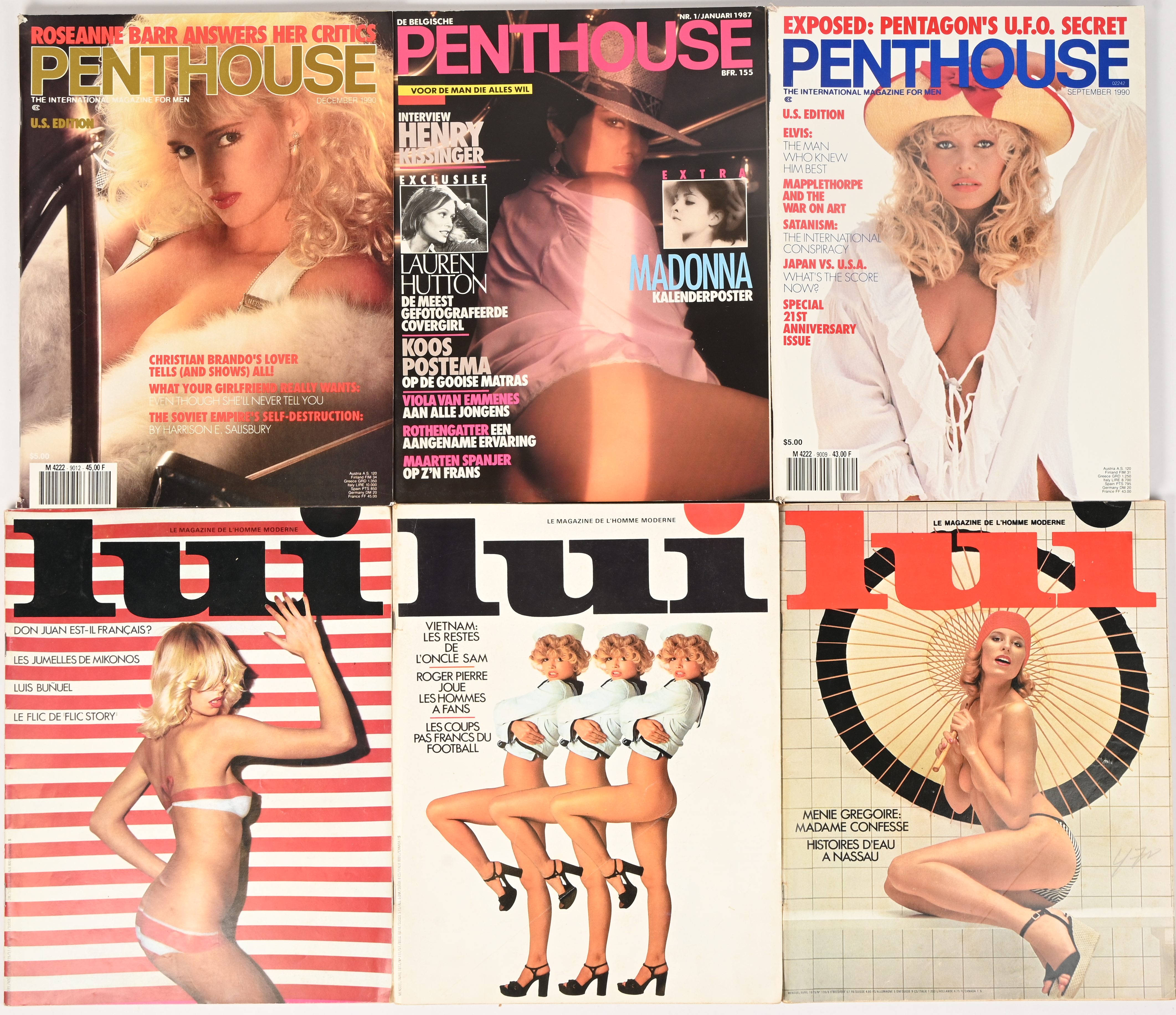 Six vintage erotic magazines. Lui (April and August 1973, April 1975) Penthouse (January 1987 Belgian, September and December 1990 U.S. edition).