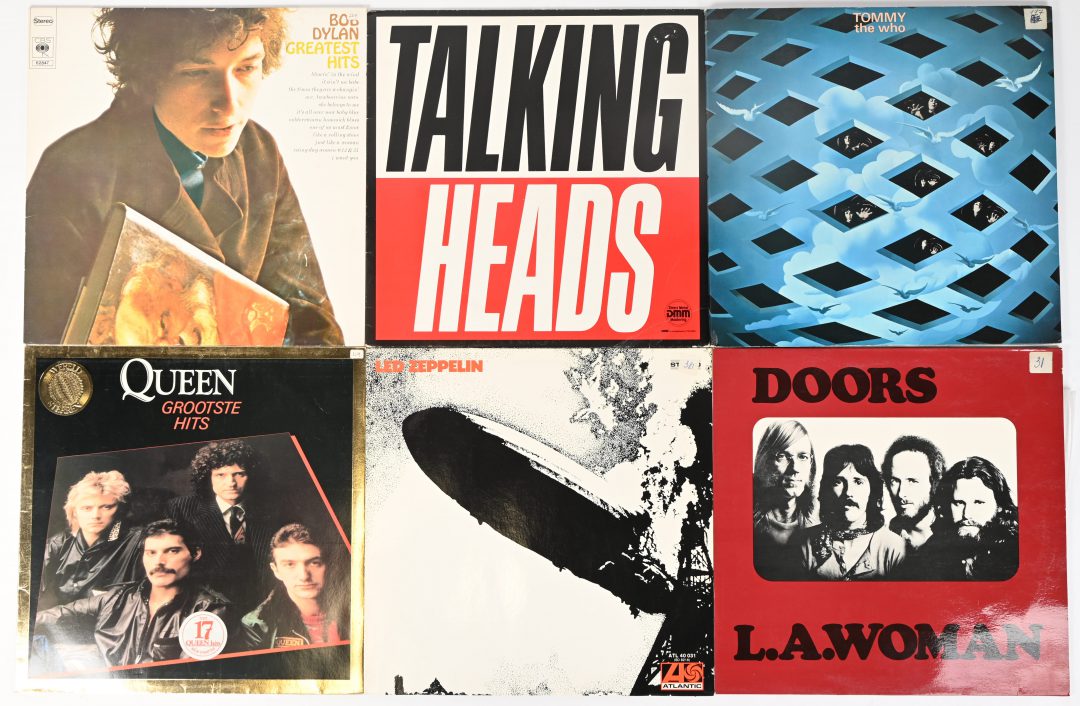 Zes vinylplaten: Led Zeppelin, ATL 40 031, Doors, LA Woman, 61623, Talking Heads, 24 0612 1, The Who, Tommy, 2612 006, Bob Dylan, Greatest Hits en Queen, Grootste Hits.