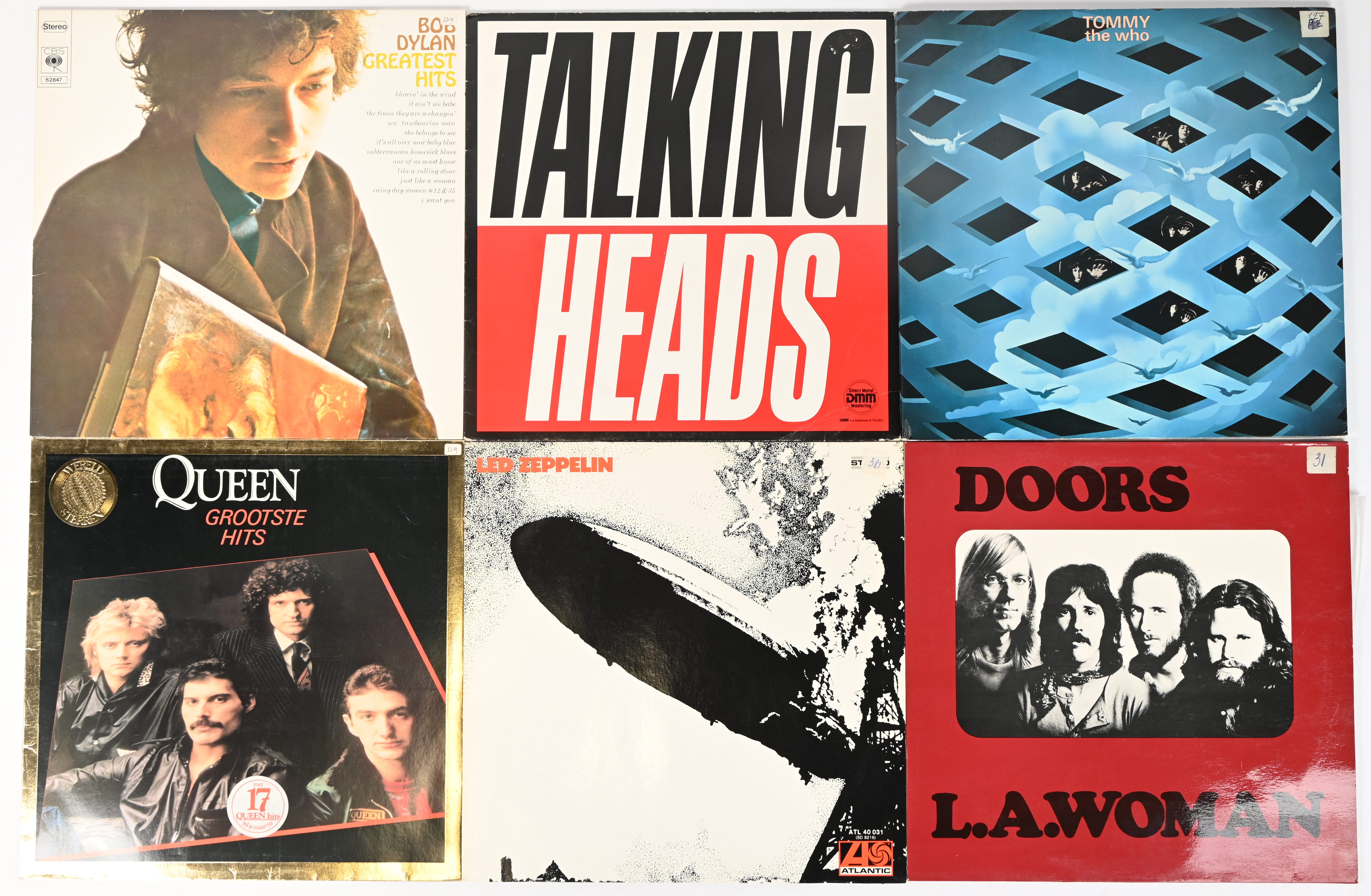 Six vinyl records: Led Zeppelin, ATL 40 031; Doors, L.A. Woman, 61623; Talking Heads, 24 0612 1; The Who, Tommy, 2612 006; Bob Dylan, Greatest Hits; and Queen, Greatest Hits.