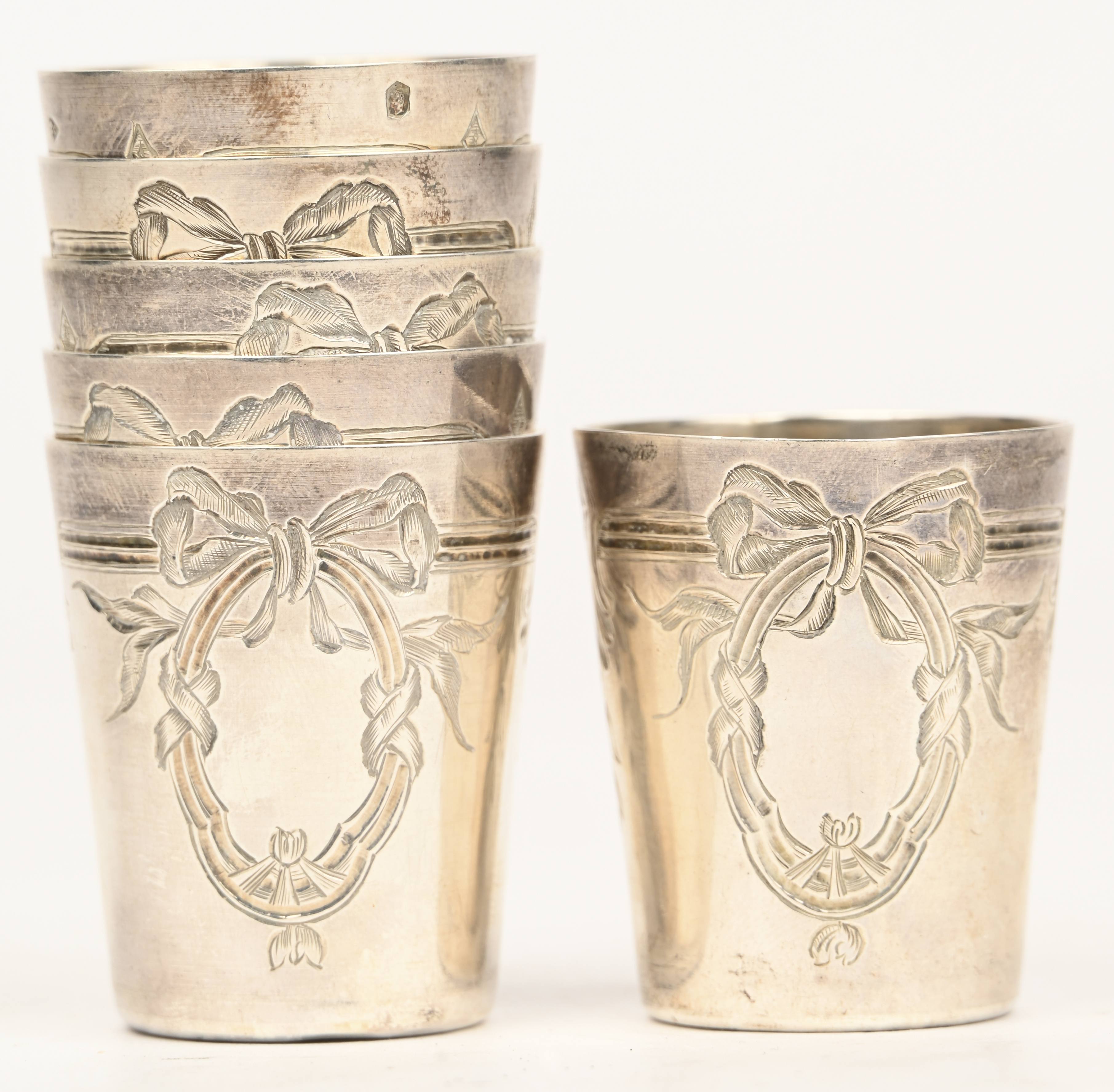 A set of 12 silver shot glasses, French hallmarked: Minerva and uppercase letters LN with a small tree between the letters. 85 grams. Dented. -
