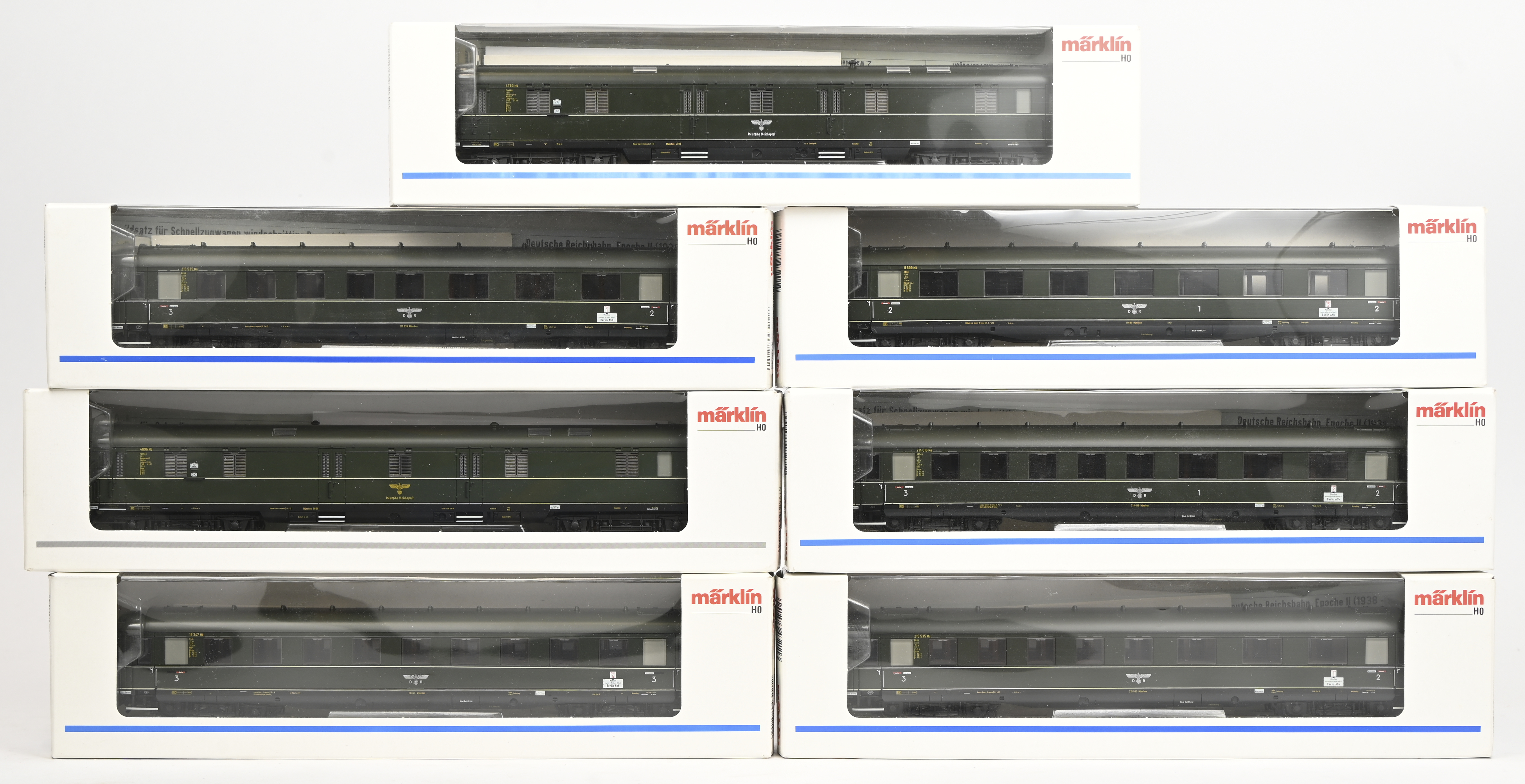 Zeven Märklin wagons voor personenvervoer. 43201, 2X 43211, 43221, 43231, 43261 en 43266. In OVP.