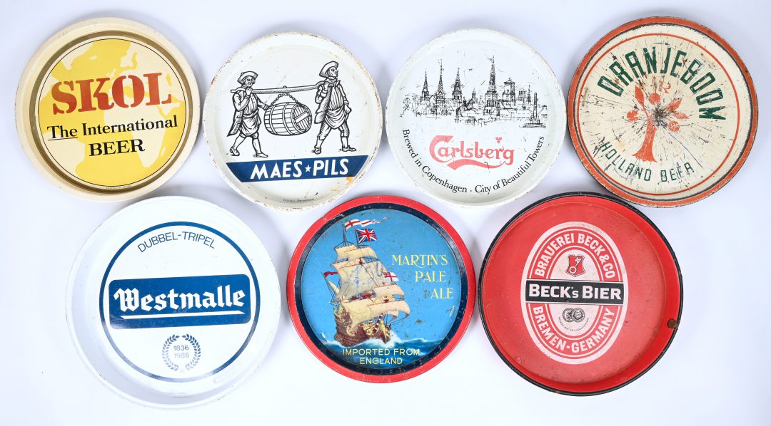 Seven vintage metal advertising trays. Westmalle, Beck’s, Carlsberg, Martin’s Pale Ale, Skoil, Oranjeboom, and Maes pils.