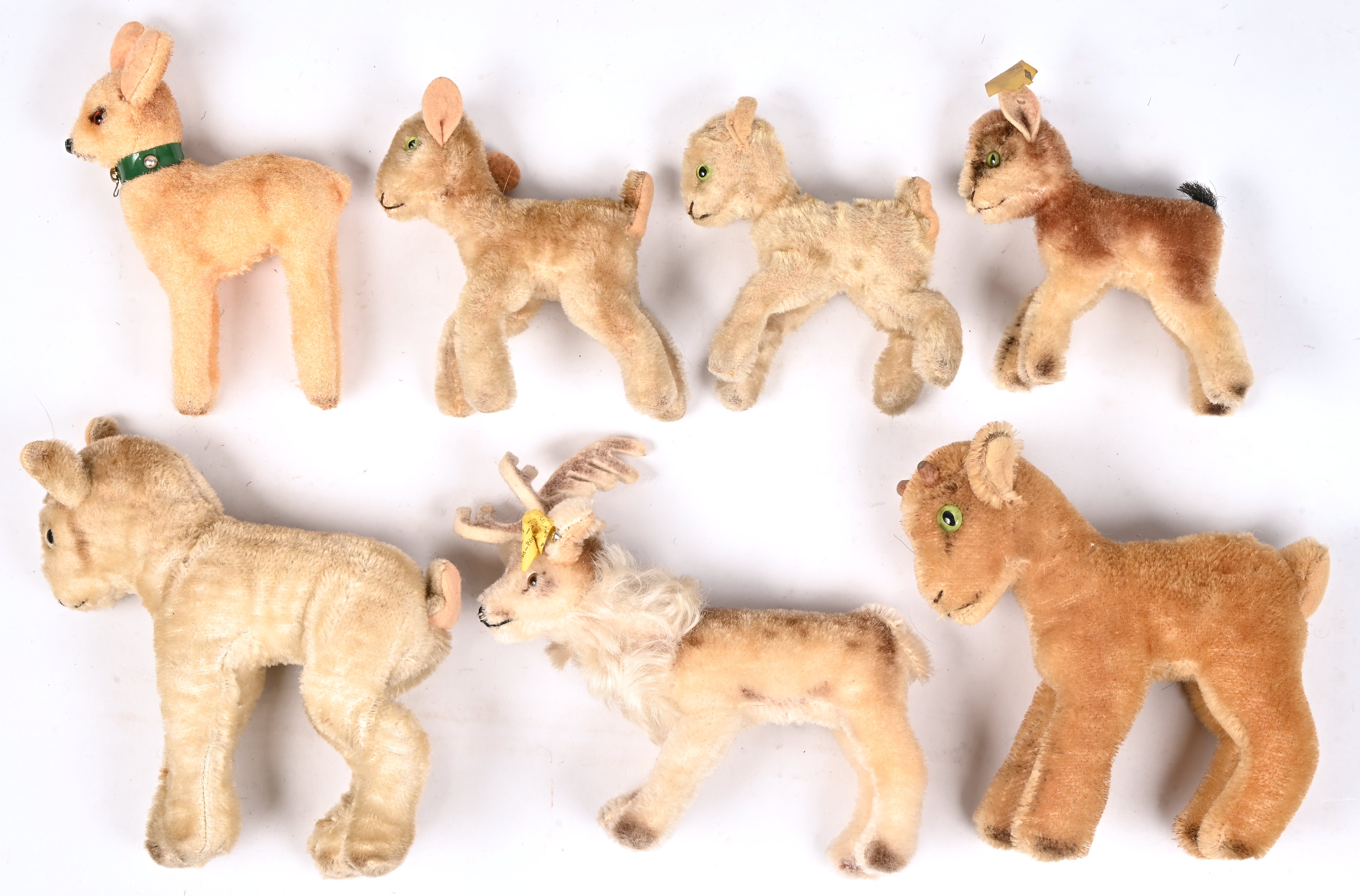 Five vintage plush goats, three marked Steiff, the others missing their button/tag. -