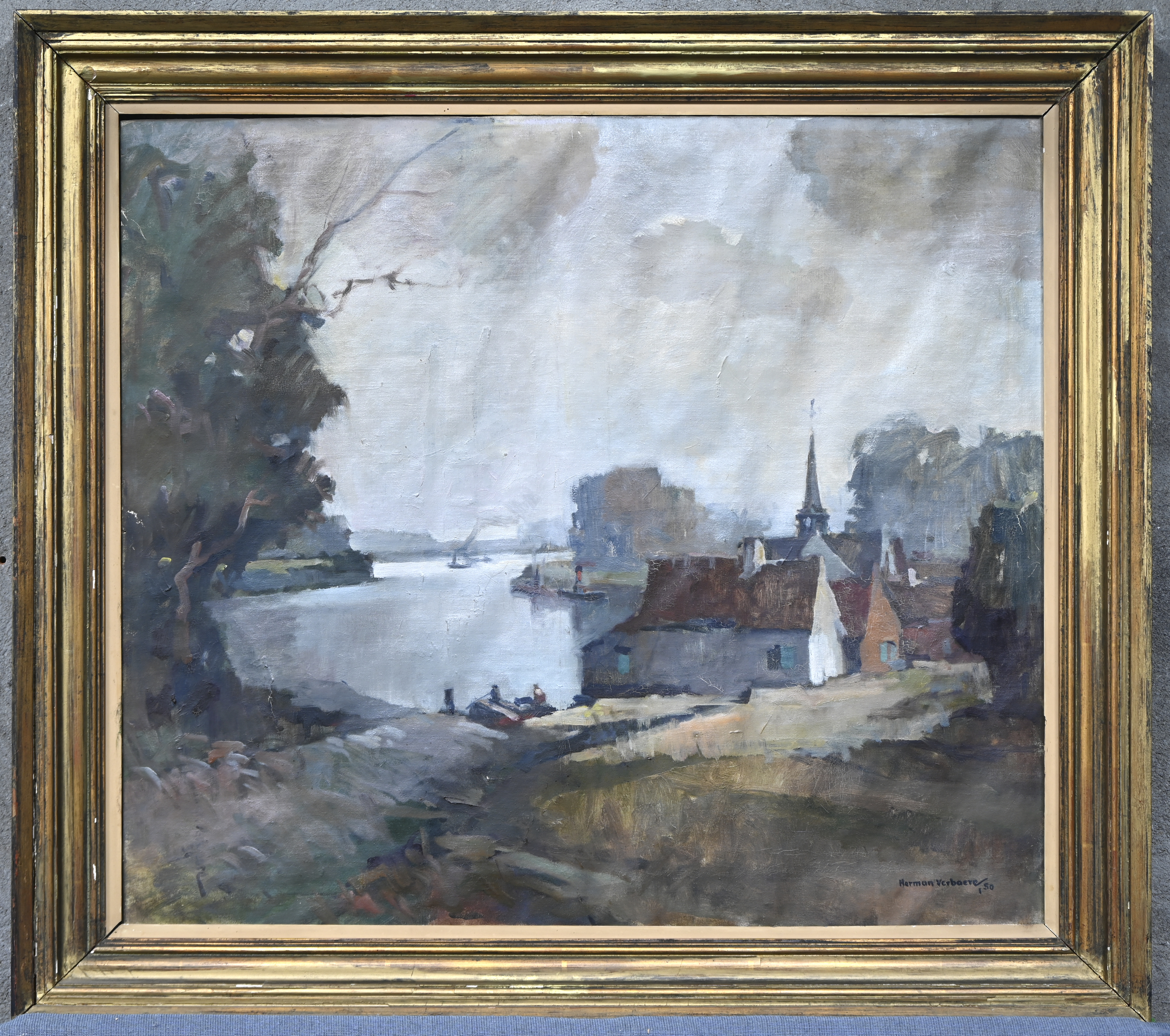 #99‘Zicht op Antwerpen vanaf linkeroever’, olieverf op doek. Een postimpressionistisch werk, niet getekend.