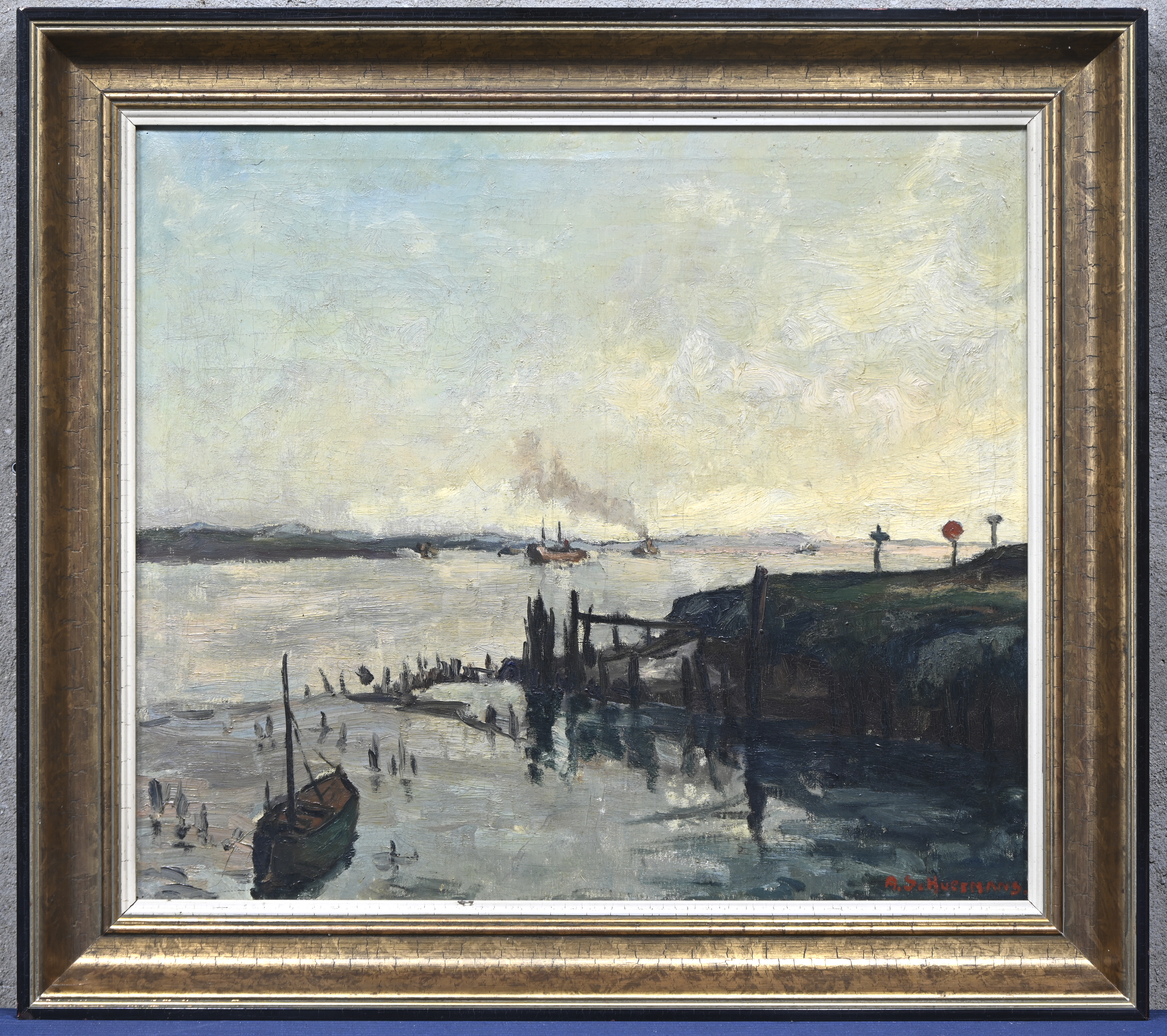 ‘Zicht op de Schelde’, olieverf op doek. Getekend A. Schuermans.