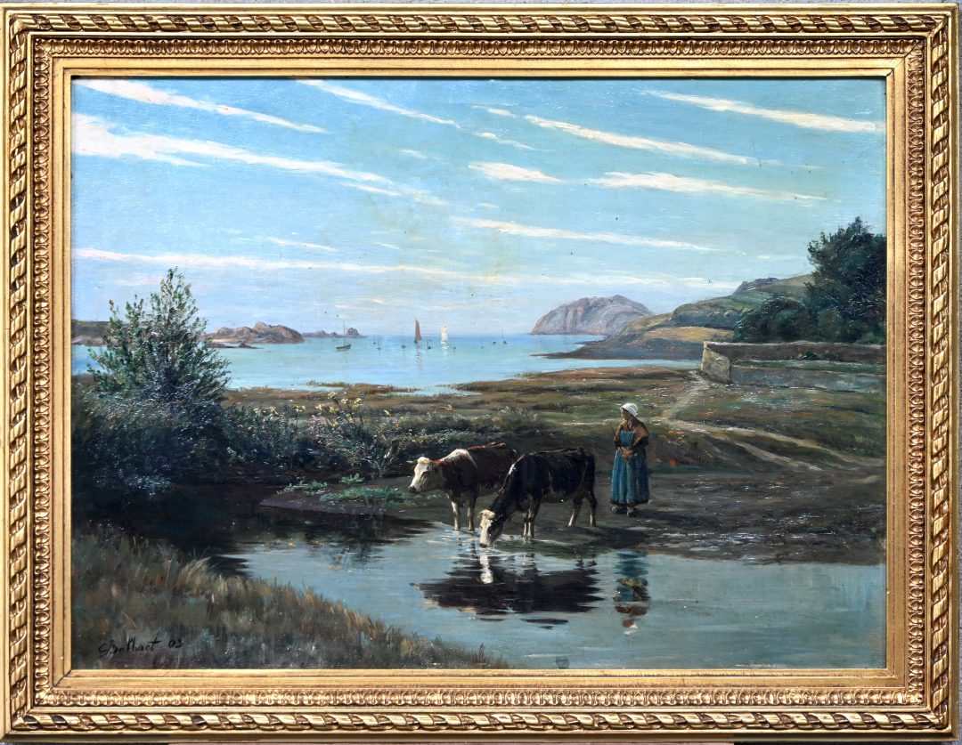 'View of a bay with grazing cows', a 19th-century oil painting on panel. Signed C. Balluret?