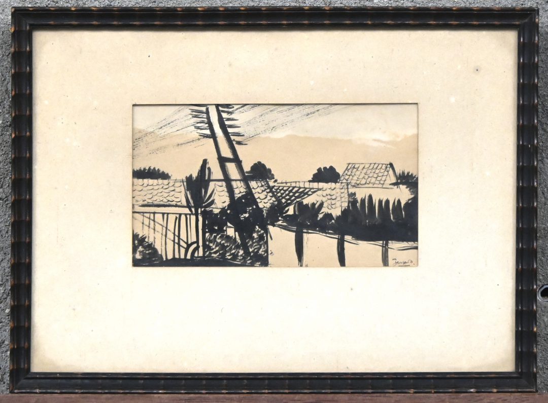 “Zicht op steenbakkerijen”, een tekening, Chinese inkt op papier, gesigneerd Jespers.